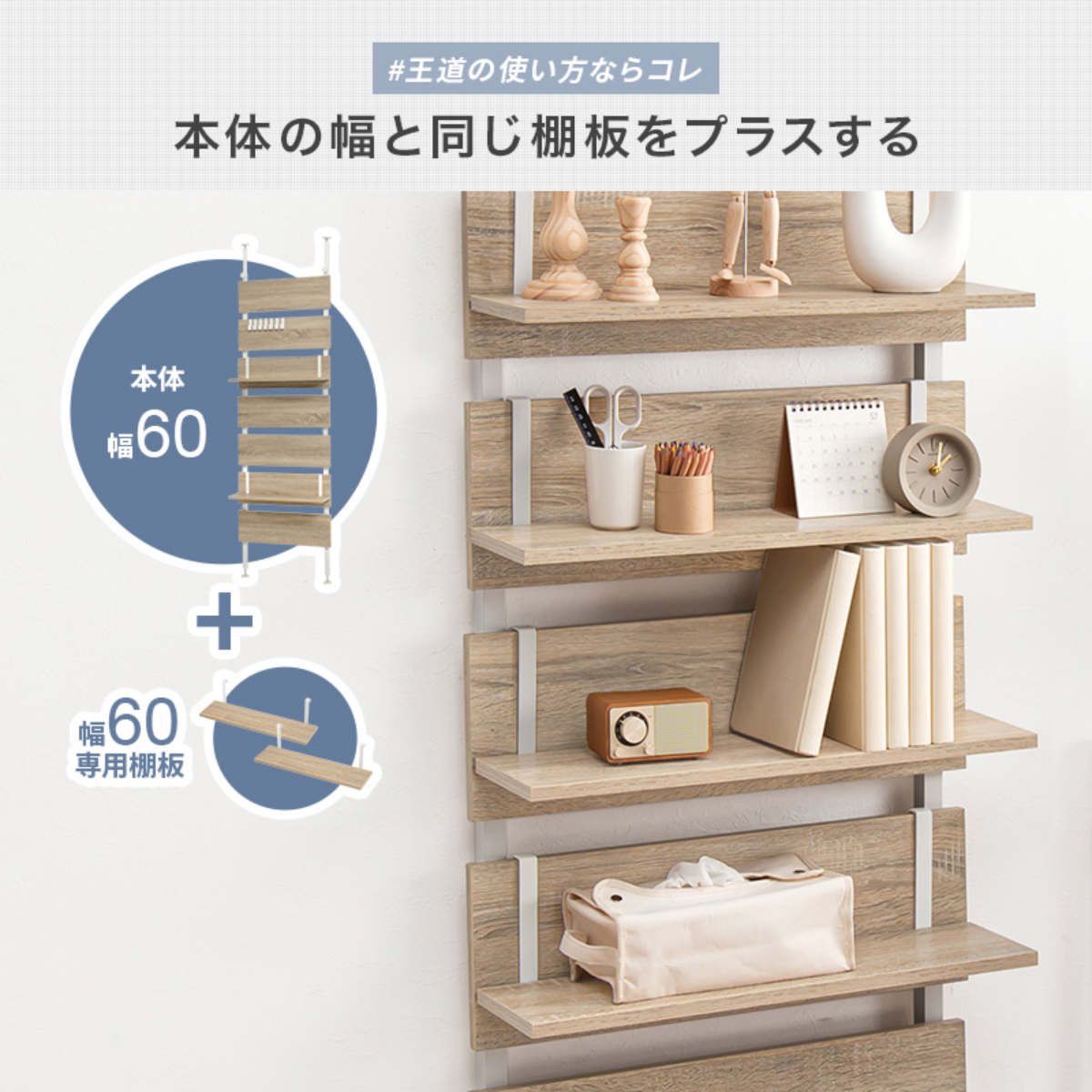 突っ張り式のウォールラックの追加棚板2枚入りです。棚板を追加していただくことで、もっと自由なレイアウトが可能です。耐荷重は1枚あたり約2kgです。