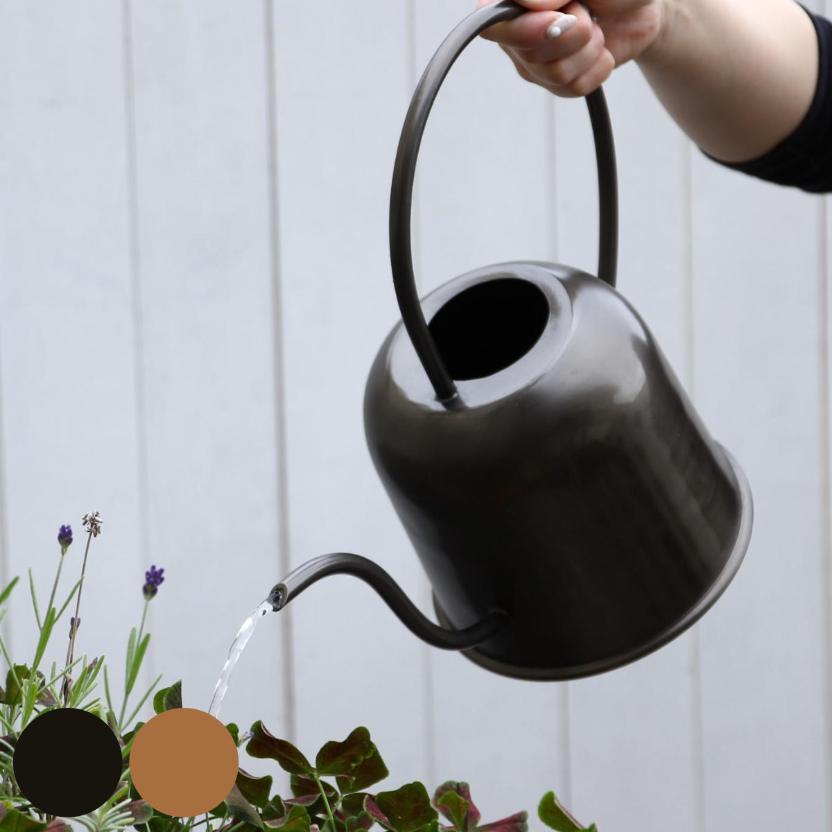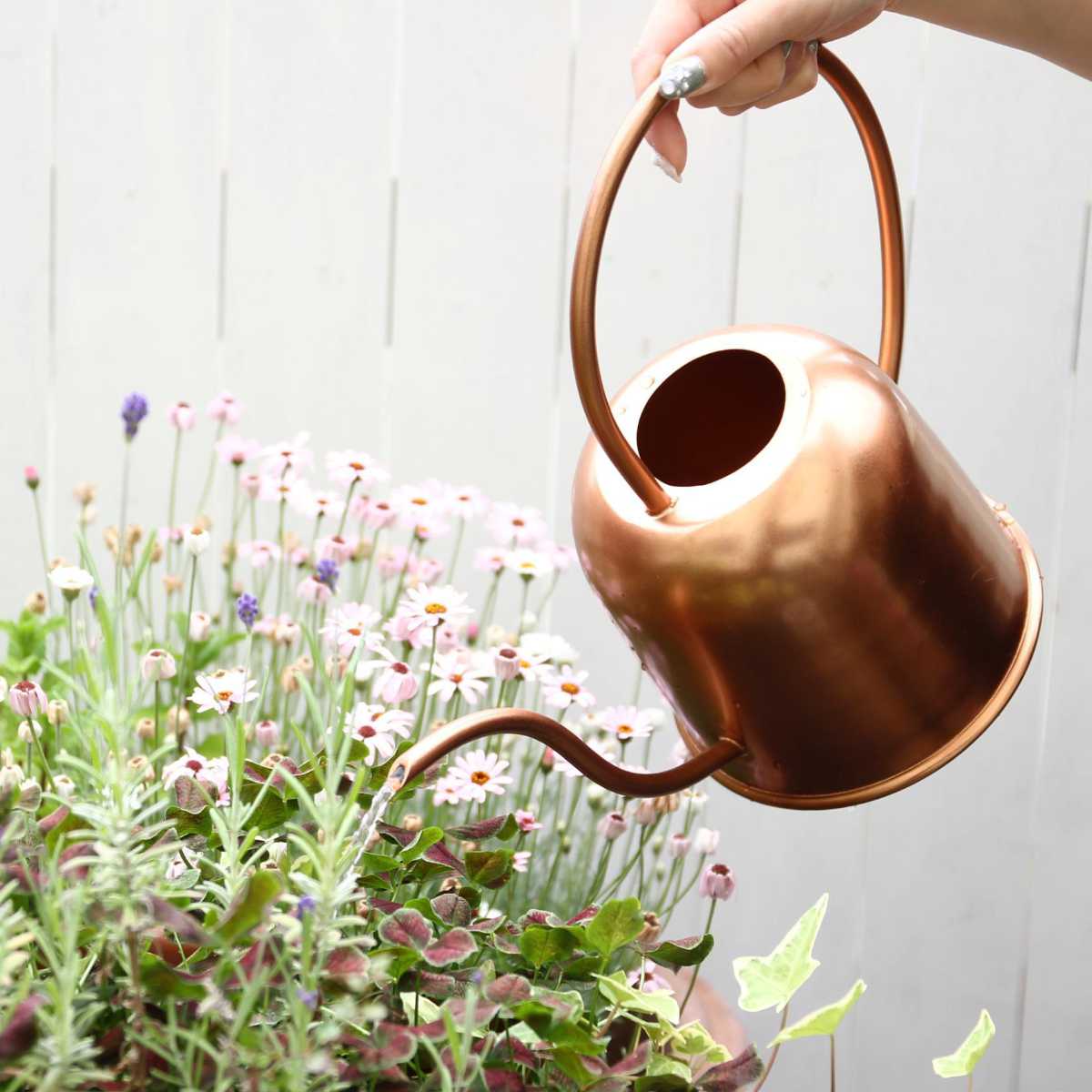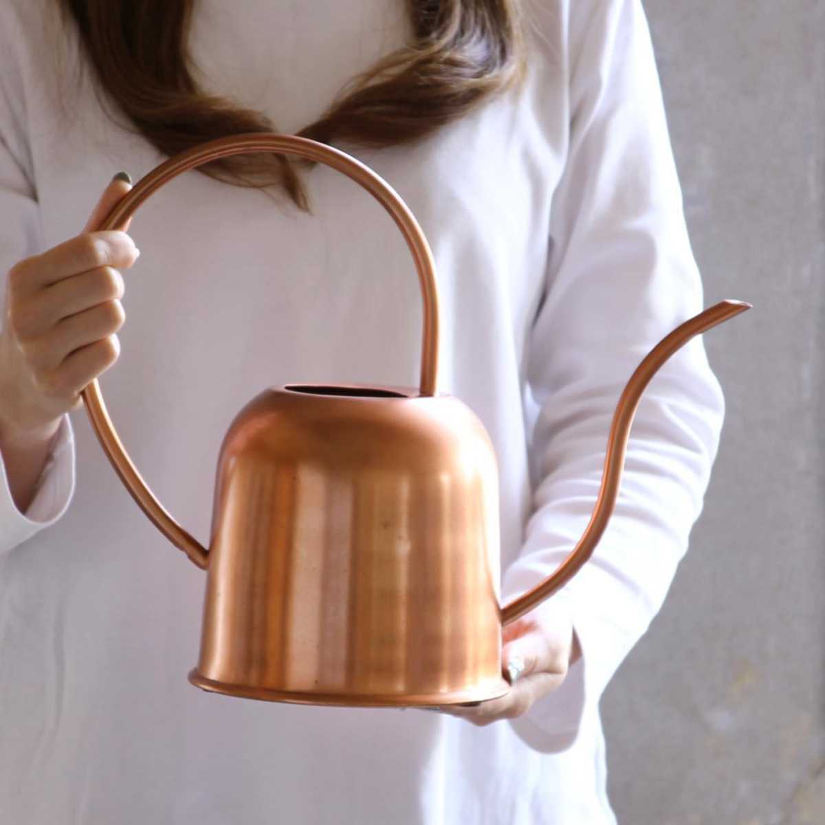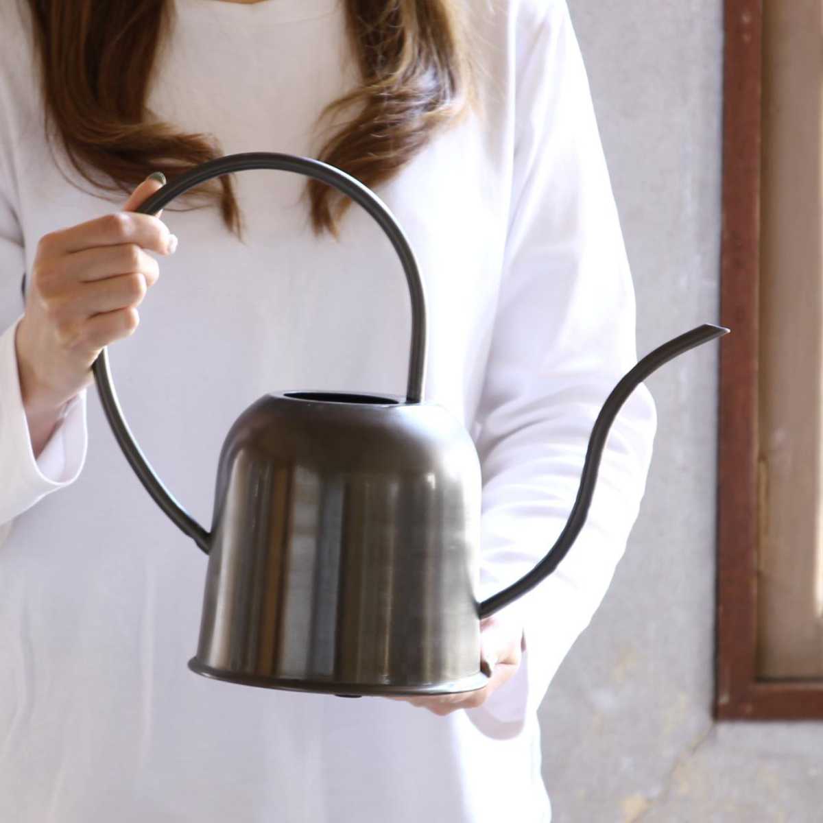 人の目を惹き付ける洗練されたデザインに質感と色味が特徴的なジョーロです。隠さずに敢えて飾って置ける、インテリアに馴染みやすいデザインです。