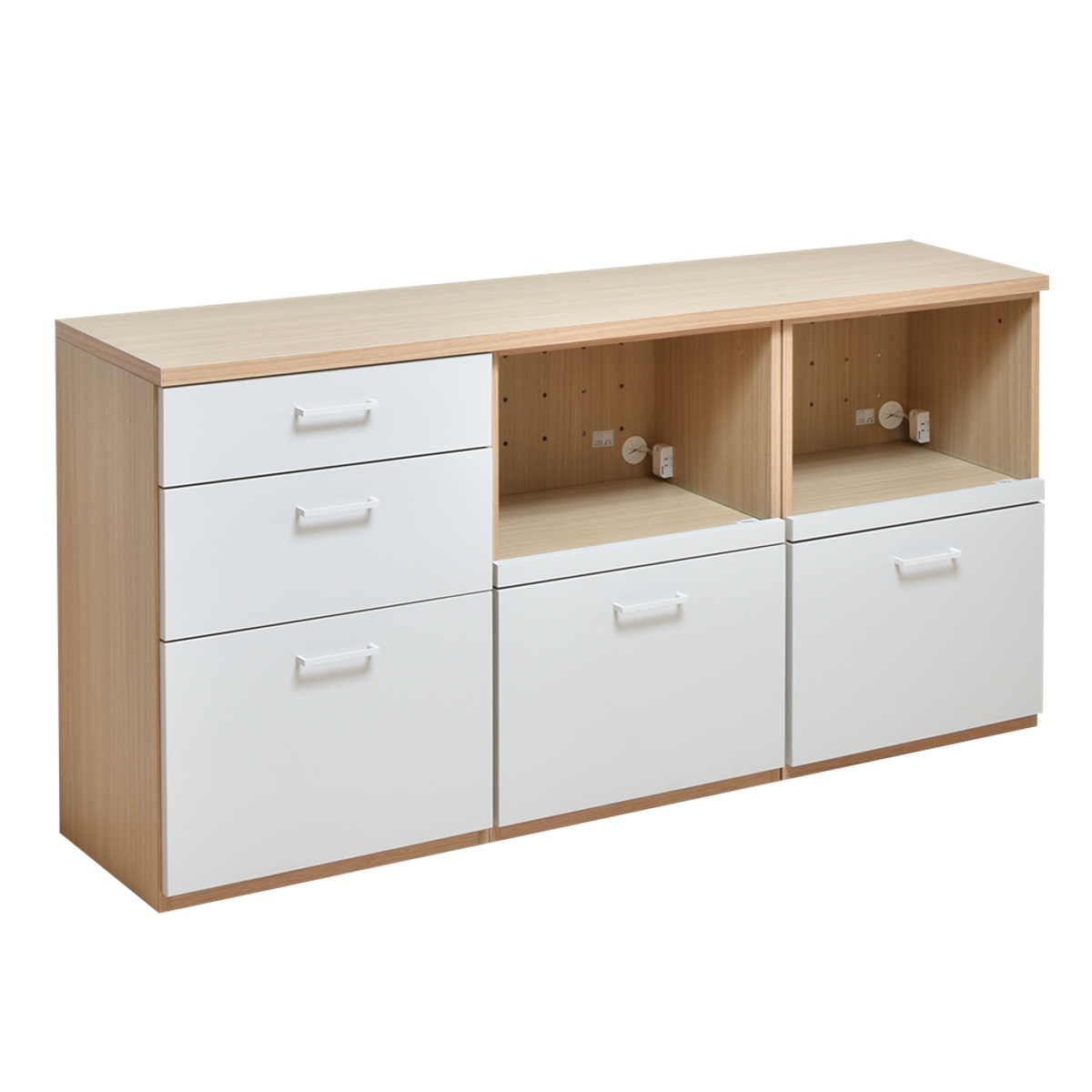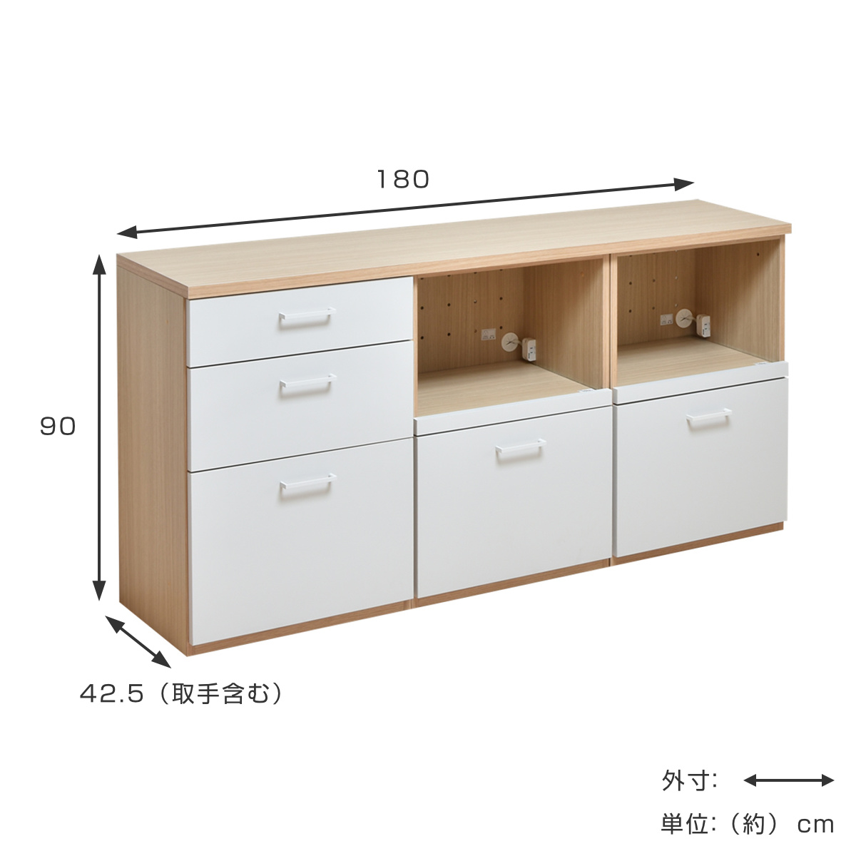キッチン収納 ユニット家具 3列カウンター チェスト 引出し 幅180cm ( 収納 家具 引き出し 台所収納 日本製 完成品 棚 食器棚 コンセント付 組み合わせ 木目調 ホワイト ナチュラル シンプル )