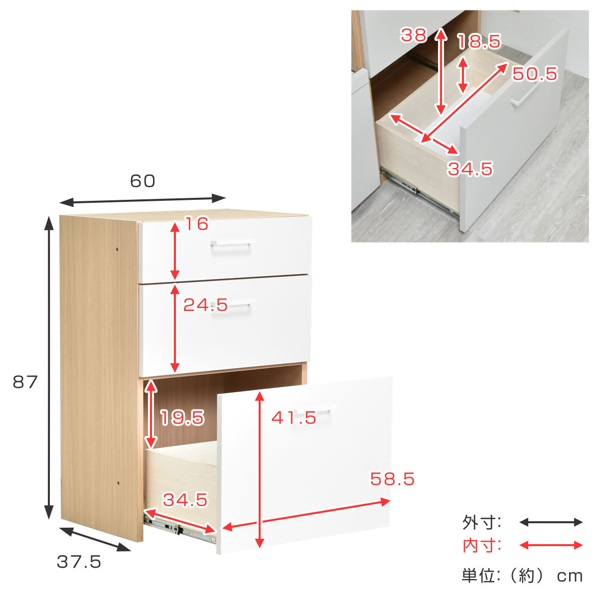 | 引き出し1段あたり耐荷重 | 約5kg |