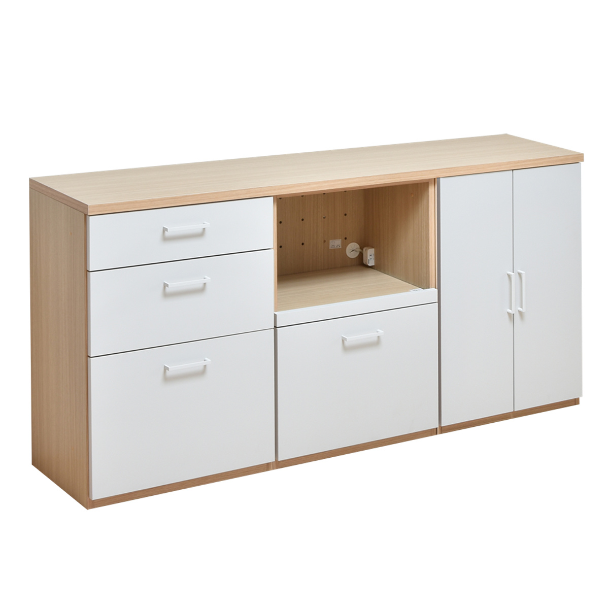 キッチン収納 ユニット家具 3列カウンター チェスト 引出し 開き戸 幅180cm ( 収納 家具 引き出し 台所収納 日本製 完成品 棚 食器棚 コンセント付 組み合わせ 木目調 ホワイト ナチュラル シンプル )