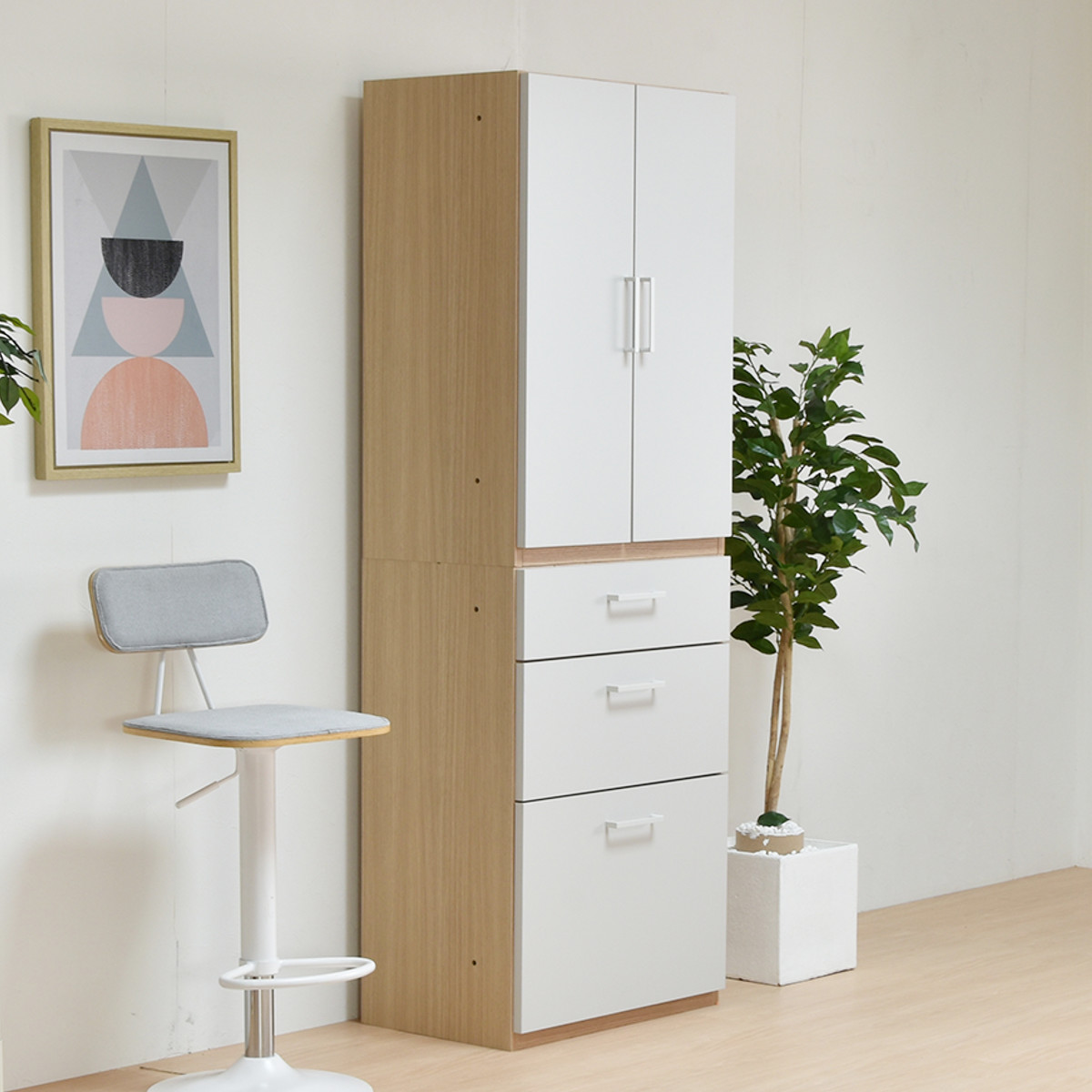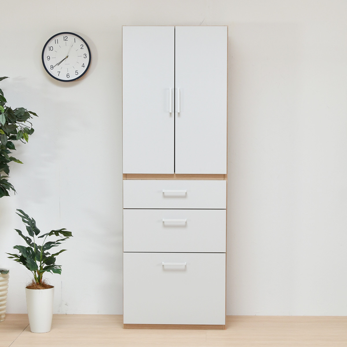 お部屋に合わせやすいシンプルなデザインの食器棚です。温かみのある木目調×ホワイトカラーが清潔感のあるナチュラルな雰囲気で、お部屋を明るく演出してくれます。キッチンではもちろん、リビングやベッドルームでも活躍する大容量収納です。