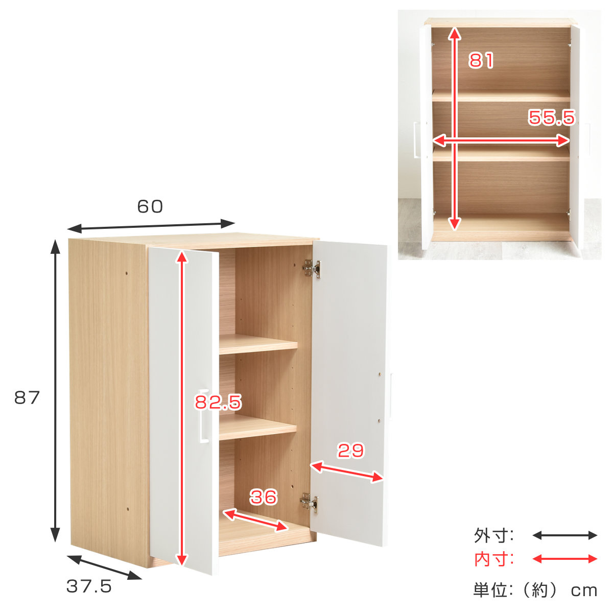 | 内容量 | 1台(開き戸+チェスト) 付属品:可動棚2枚、転倒防止ベルト |