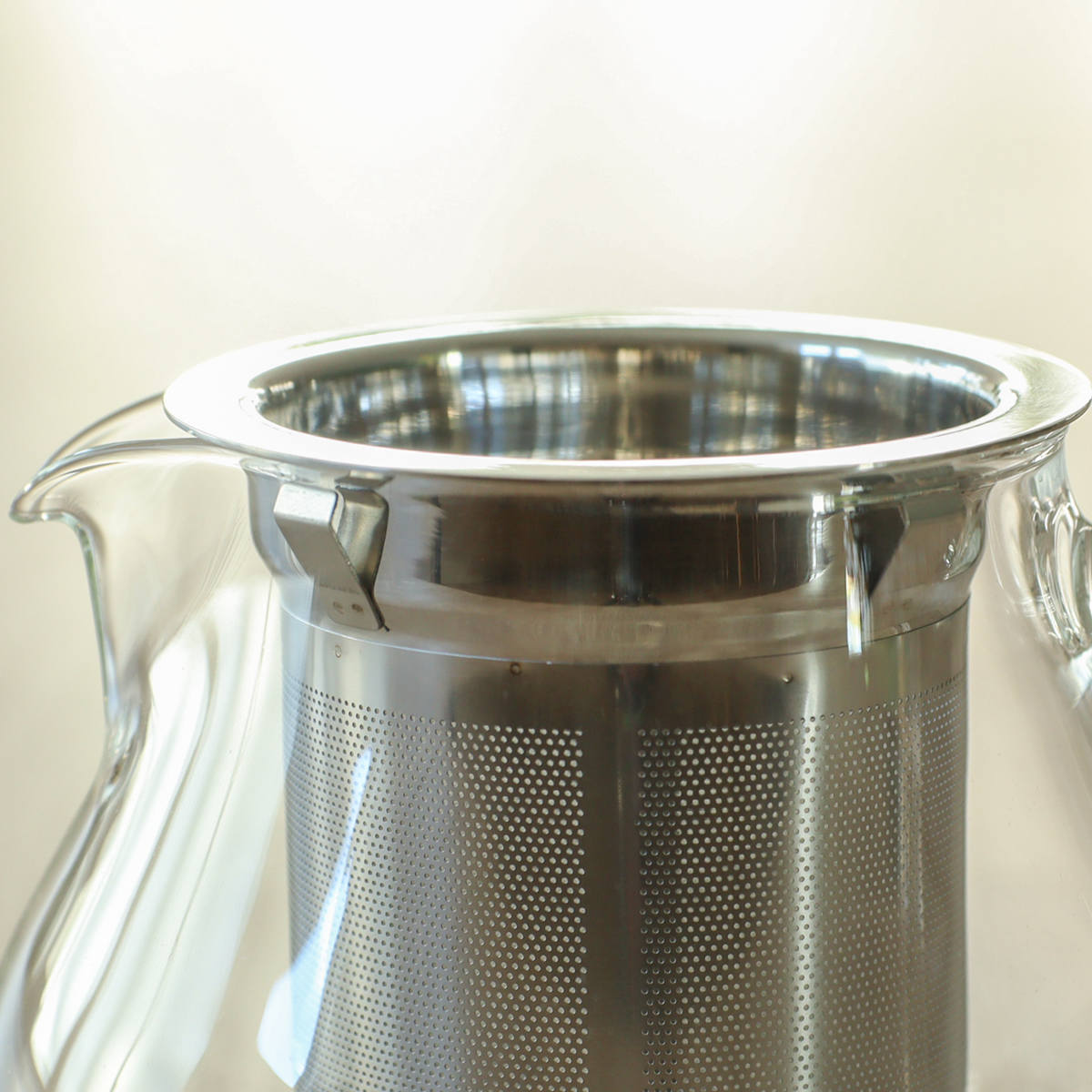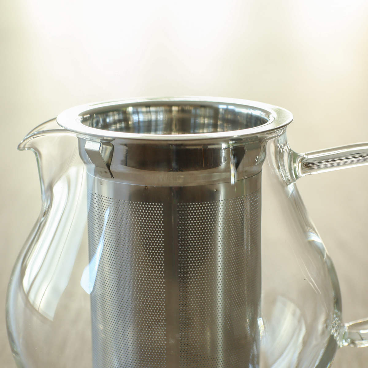 ステンレスのストレーナーは、ティーピッチャーの内側にぴったりフィットするストッパー付きです。傾けても外れにくく、スムーズに注げて日常使いにも快適です。