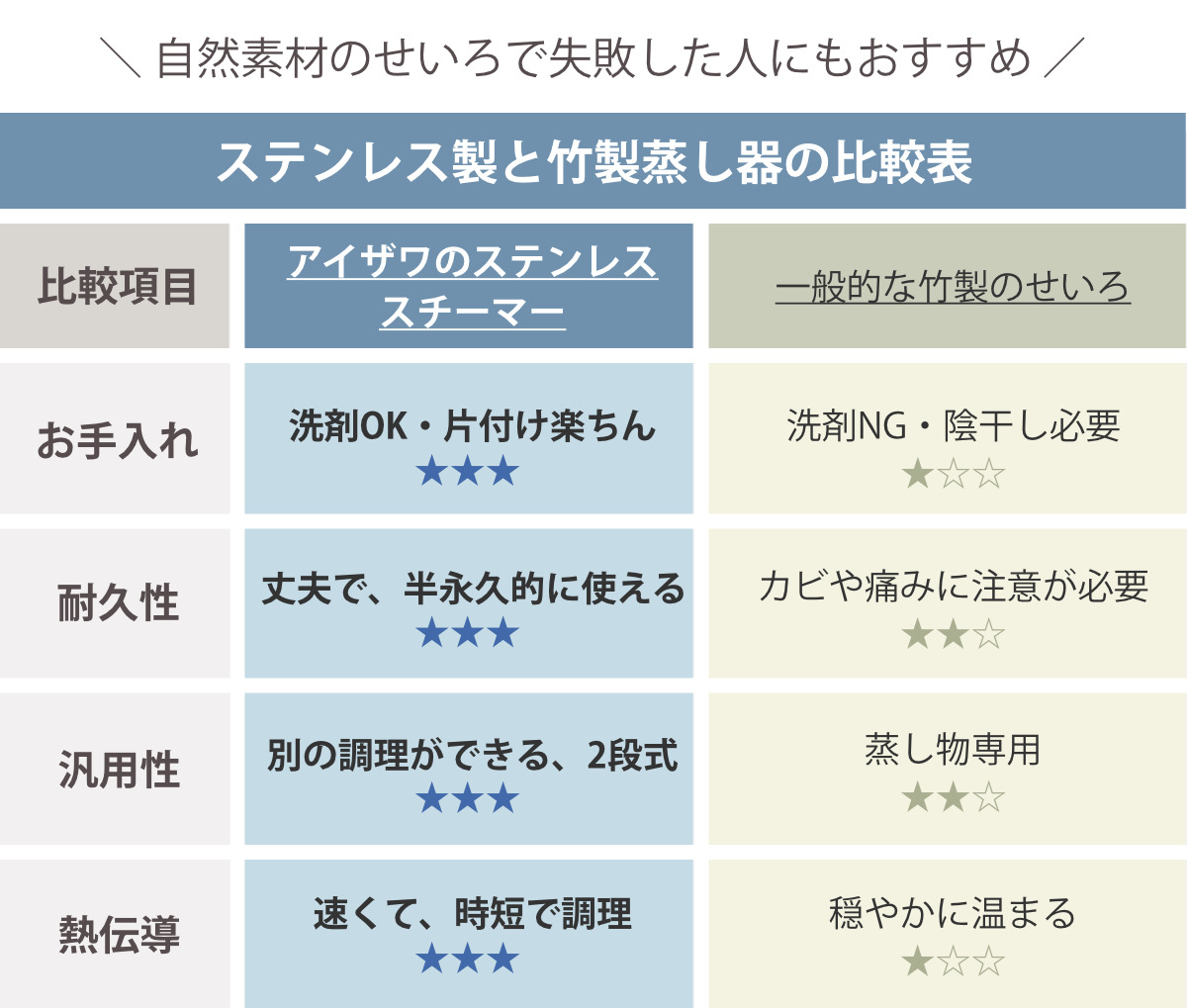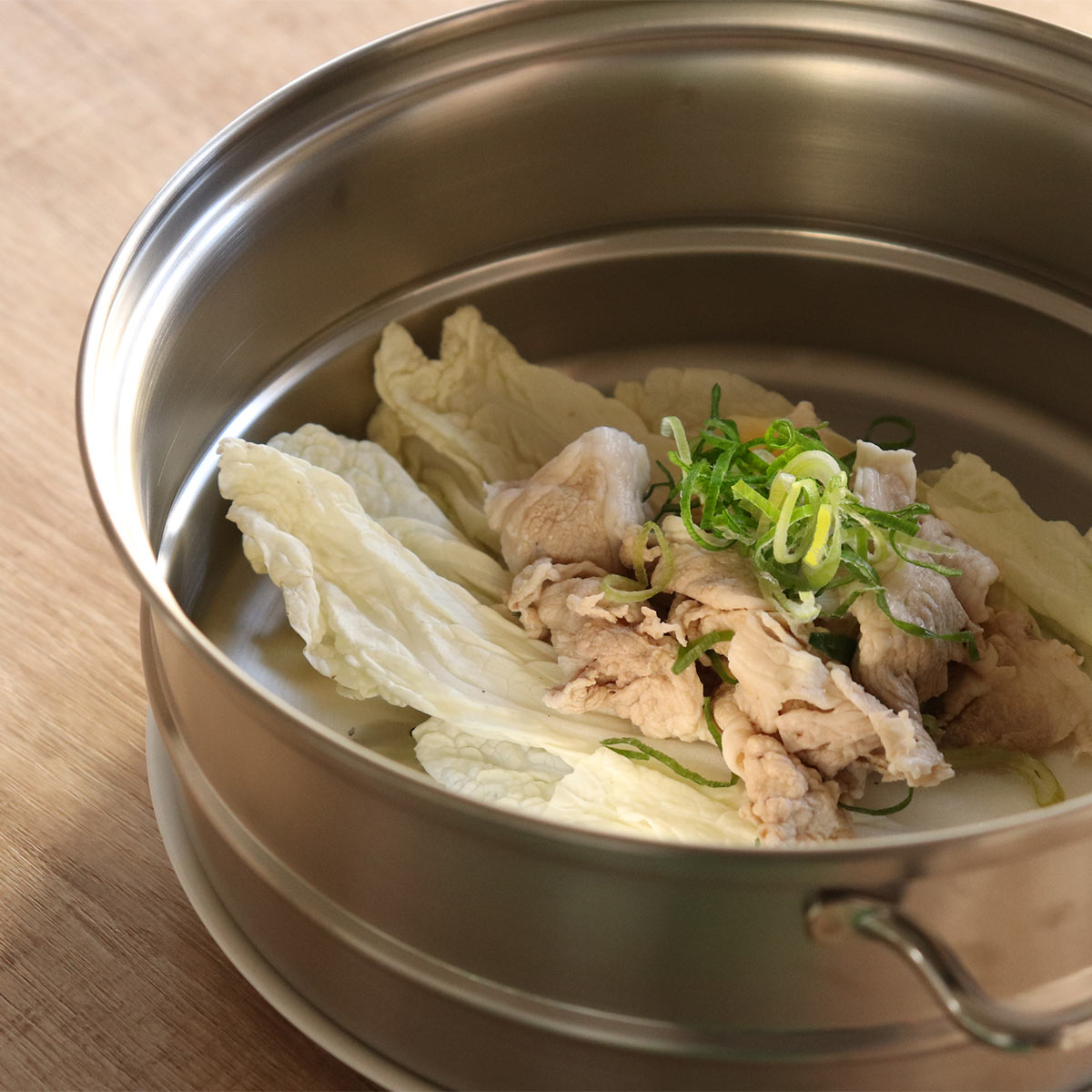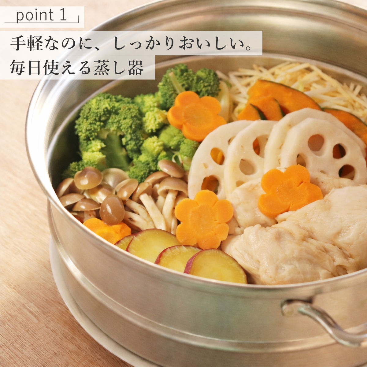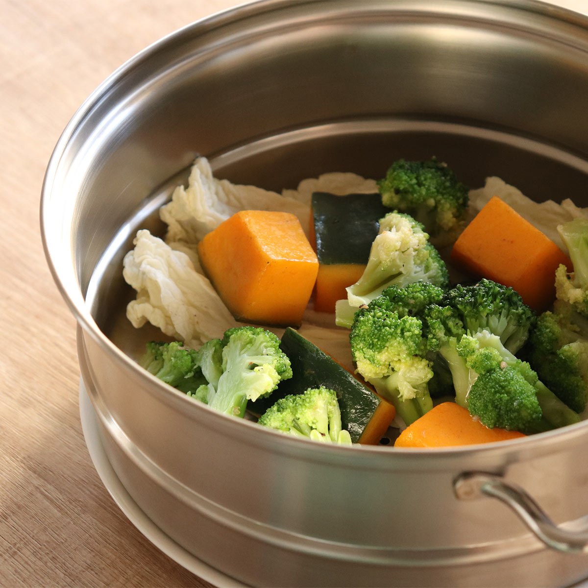 ステンレス製の蒸し器は、竹製の蒸し器と比べてお手入れが簡単で、毎日気軽に使えるのが特長。電子レンジ調理では出にくい、野菜本来の甘みや食感を楽しめます。