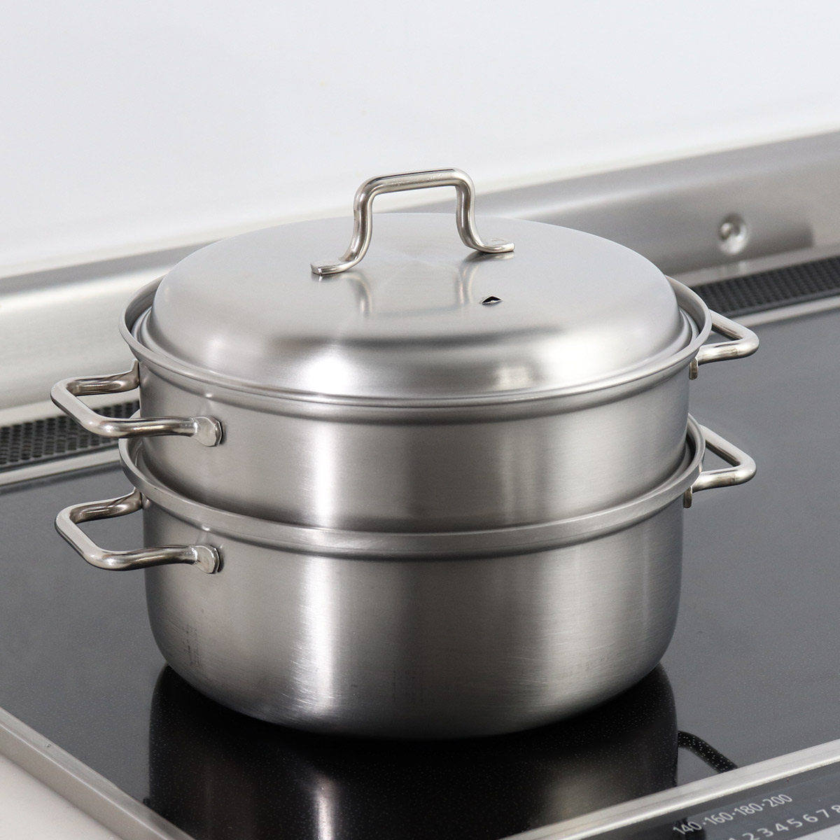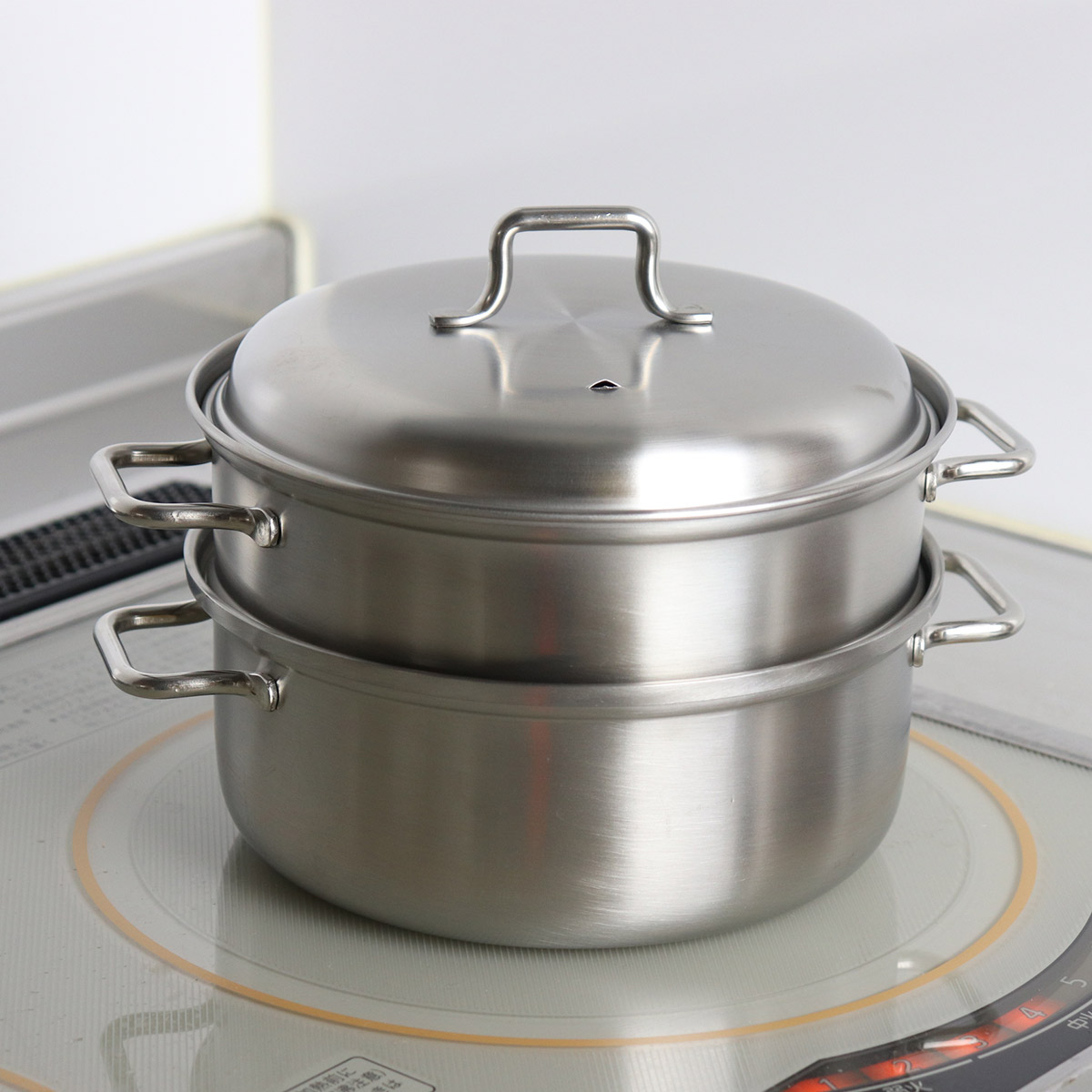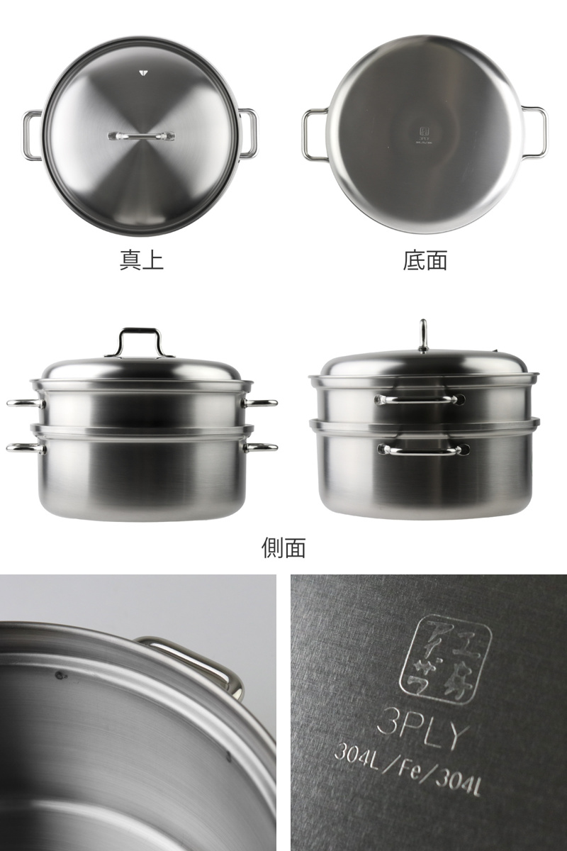 | 材質 | 上鍋・蓋:18-8ステンレス鋼(クロム18%、ニッケル8%) 下鍋:ステンレス三層鋼(18-10ステンレス鋼(クロム18%、ニッケル10%)/鉄/18-10ステンレス鋼(クロム18%、ニッケル10%)) |