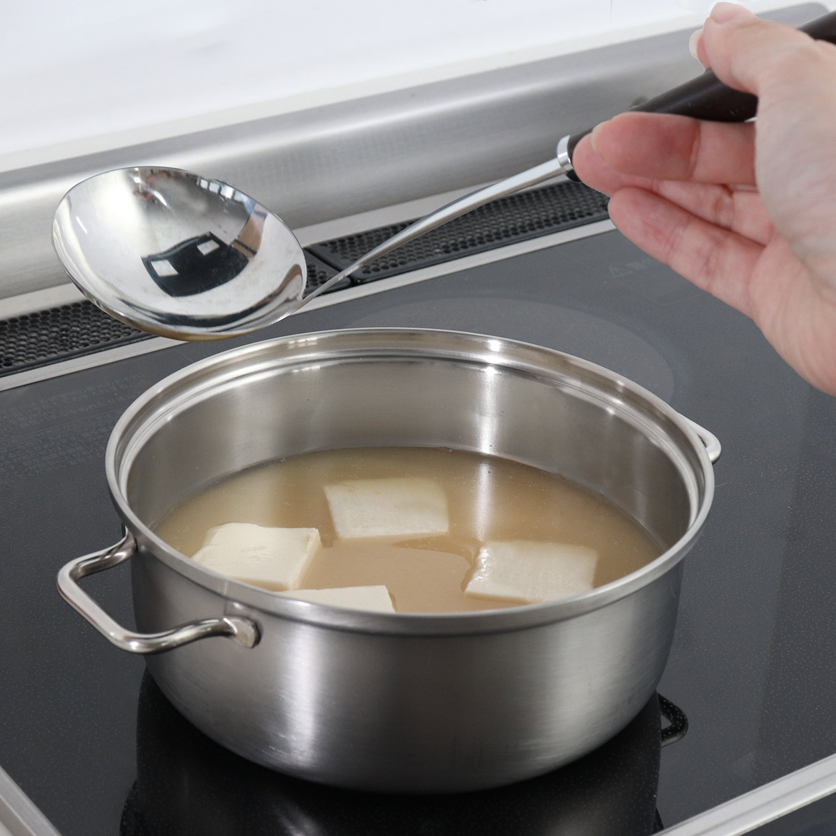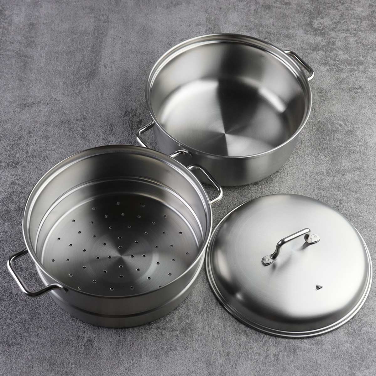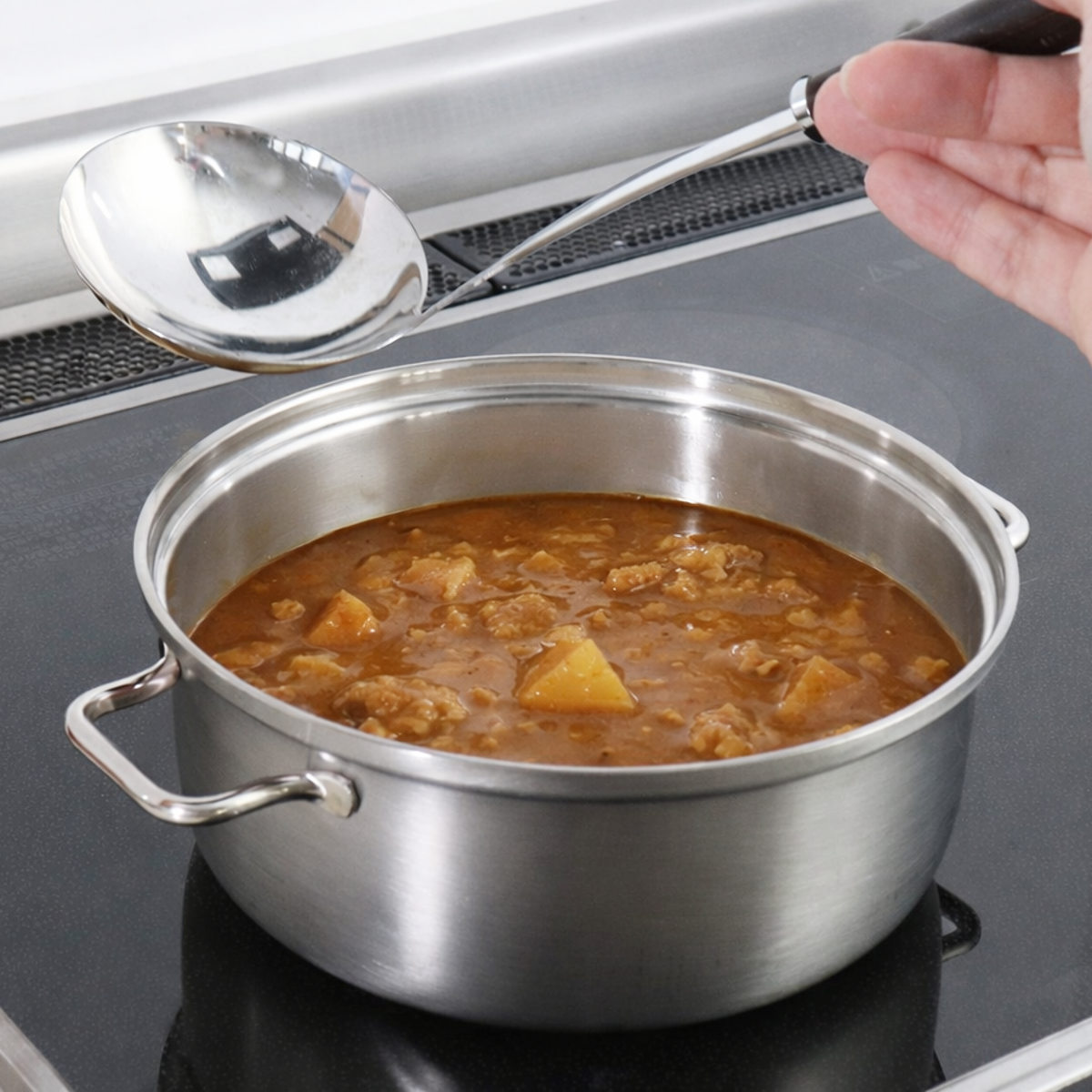 | 材質 | 上鍋・蓋:18-8ステンレス鋼(クロム18%、ニッケル8%) 下鍋:ステンレス三層鋼(18-10ステンレス鋼(クロム18%、ニッケル10%)/鉄/18-10ステンレス鋼(クロム18%、ニッケル10%)) |