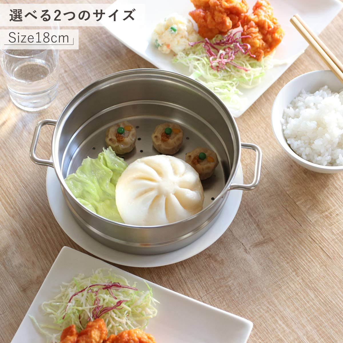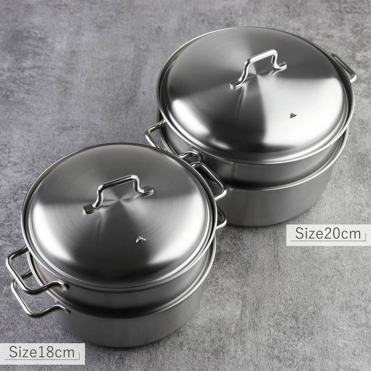 直径「18cm」と「20cm」のサイズ展開です。少量でも気軽に蒸し料理を楽しめる18cm。たっぷりと蒸し料理を楽しみたい20cm。その他にも、お弁当用の野菜を蒸したり、1人分の冷やご飯をあたためたい時など、使用用途に合わせてお好みのサイズをお選びください。