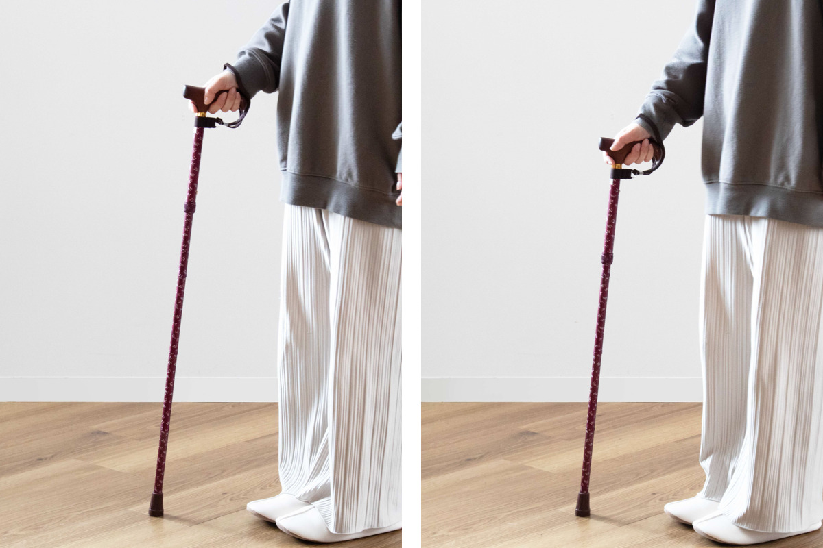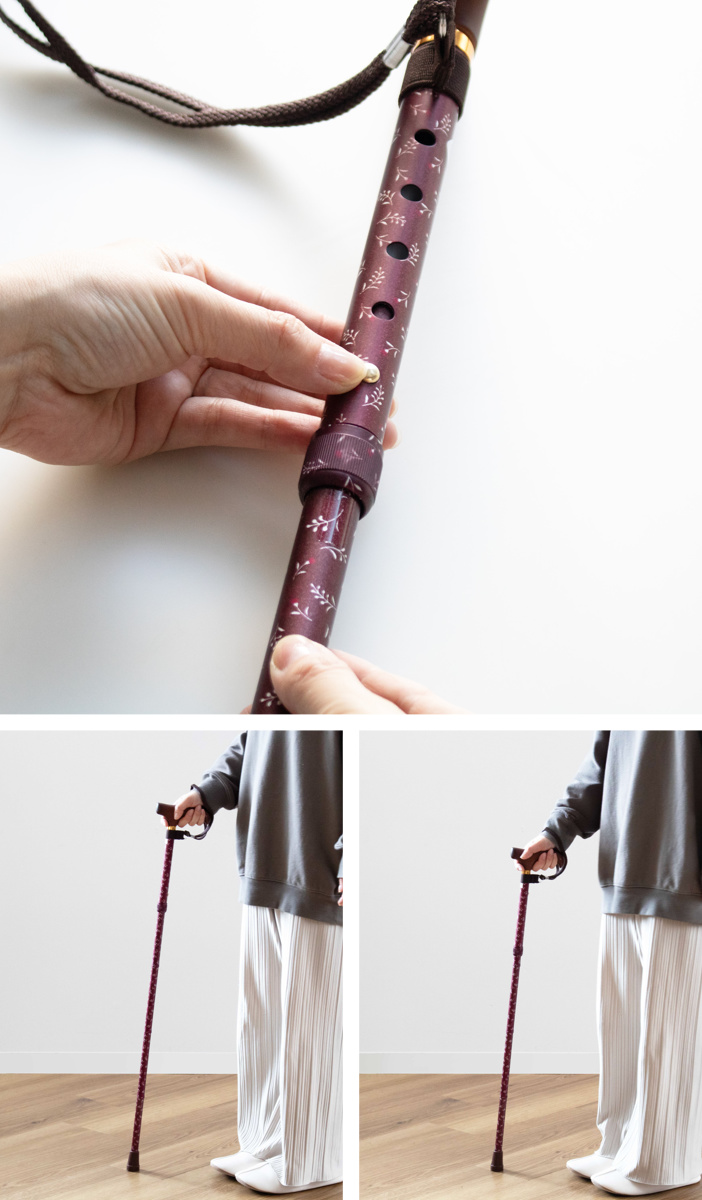 杖の長さは2.5cm間隔で5段階に調節できます。ボタンを押しながらシャフトをスライドします。