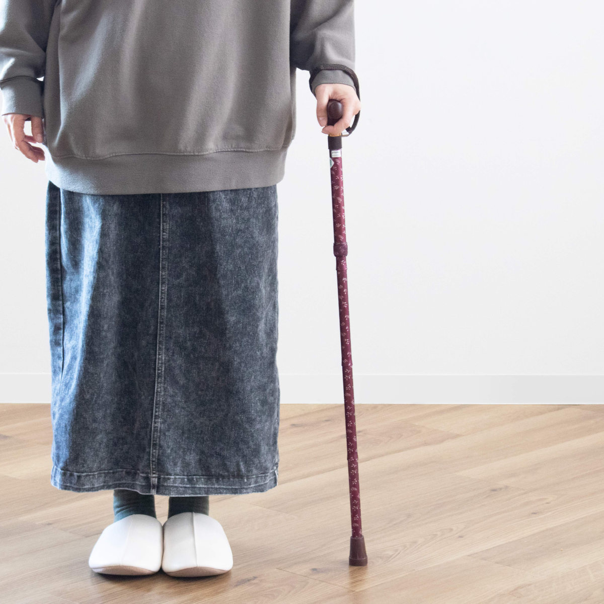 腕と杖が一直線になるように持ってください。グリップの一部だけを握ると不安定になり危険です。