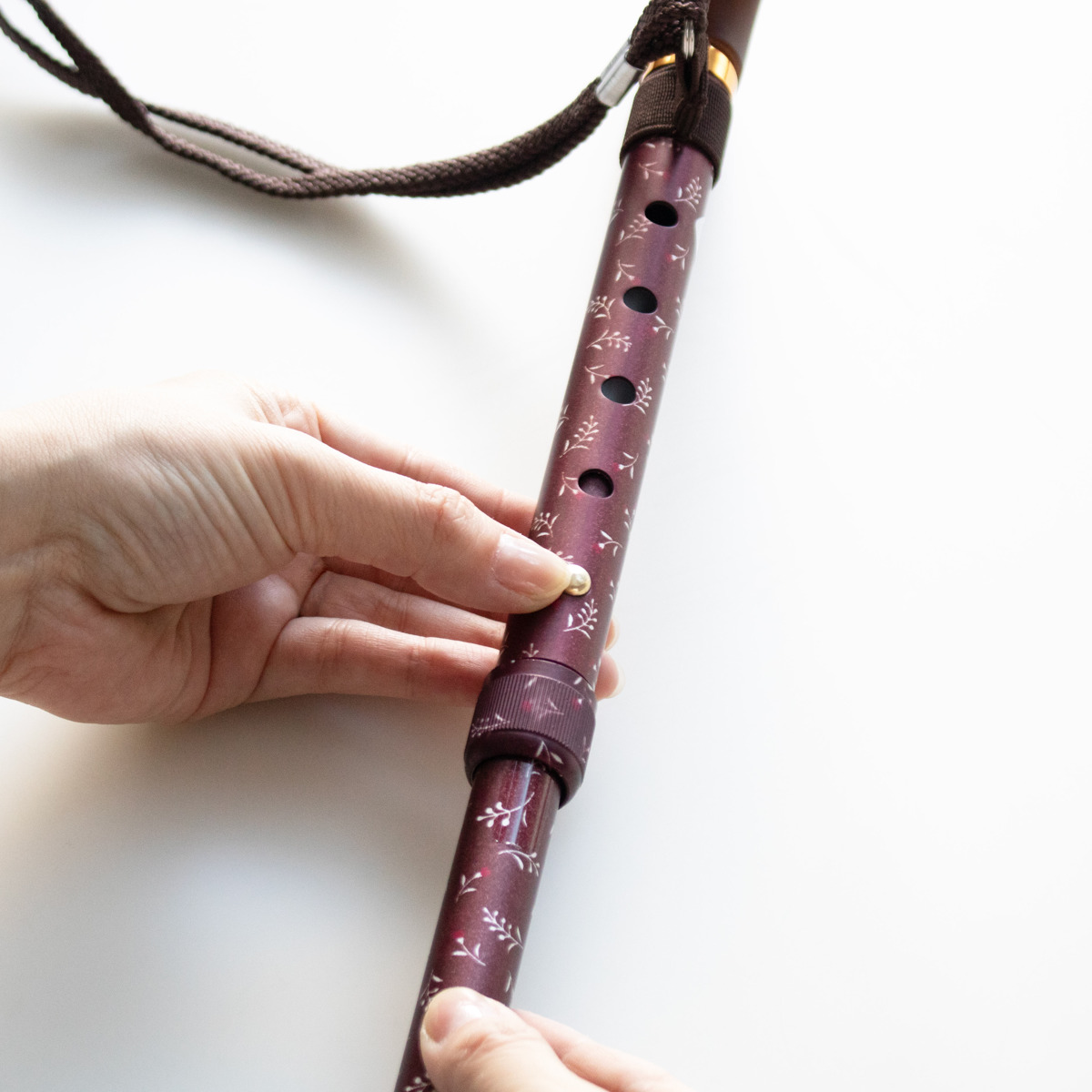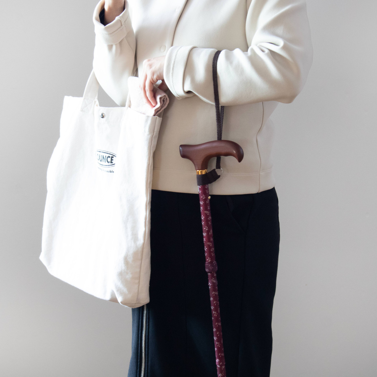 ストラップを手首に通せば、両手が自由になり、置き場所にも困りません。杖を置き忘れたり、倒したりすることも少なくなります。