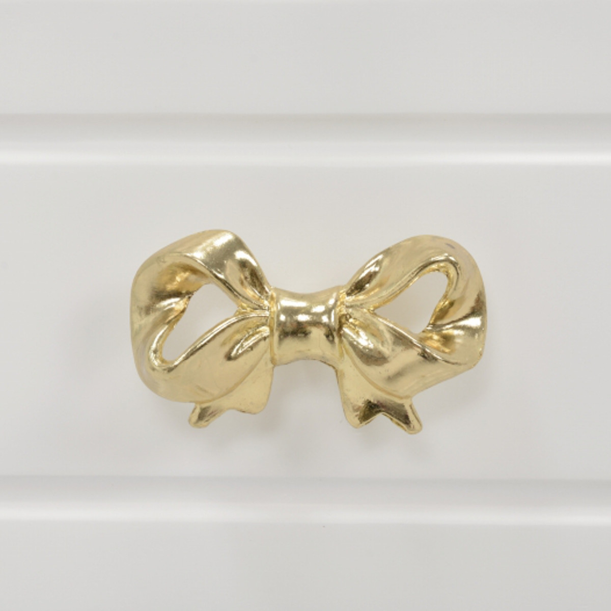 引出しはゴールドカラーのキュートなリボン型の取っ手です。