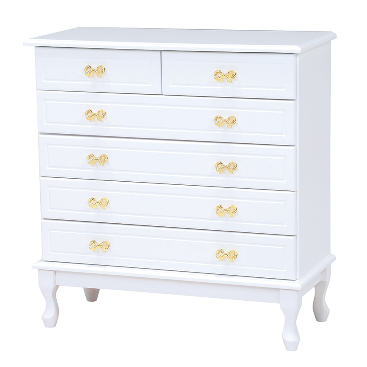 曲線を描く猫脚が美しい、アンティーク調のお洒落な5段ワイドチェストです。プリンセス風のお部屋はもちろん、様々なお部屋に馴染みやすいシックなホワイトカラーです。