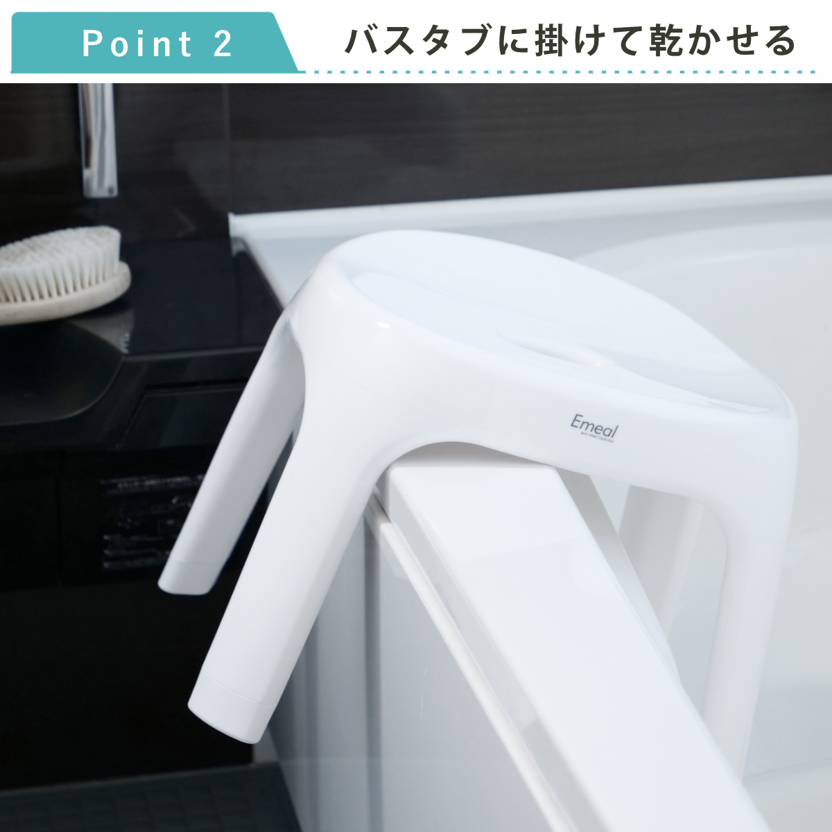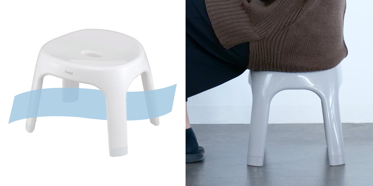 | 抜群の通気性 湿気の多い浴室だからこそ、通気性にこだわりました。脚の部分がフルオープンなので風通しがよく素早く乾燥、カビの発生を押さえます。 | 洗練されたディテール 座面は、座りやすく安定感のある丸い形状になっています。体に沿うようなカーブが体に優しくフィットします。 |