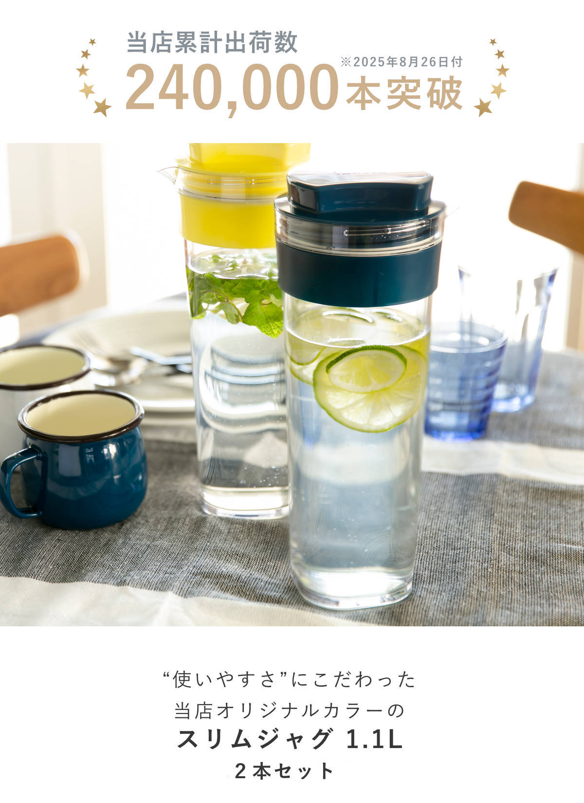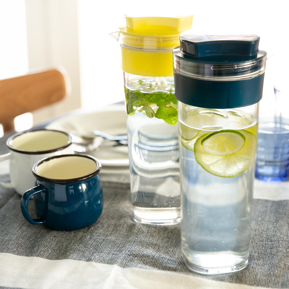 冷水筒 スリムジャグ 1.1L ネイビー 同色2本セット ( 横置き 縦置き 耐熱 日本製 麦茶ポット ピッチャー 水差し 熱湯 白 おしゃれ 麦茶 冷水ポット 1リットル プラスチック )