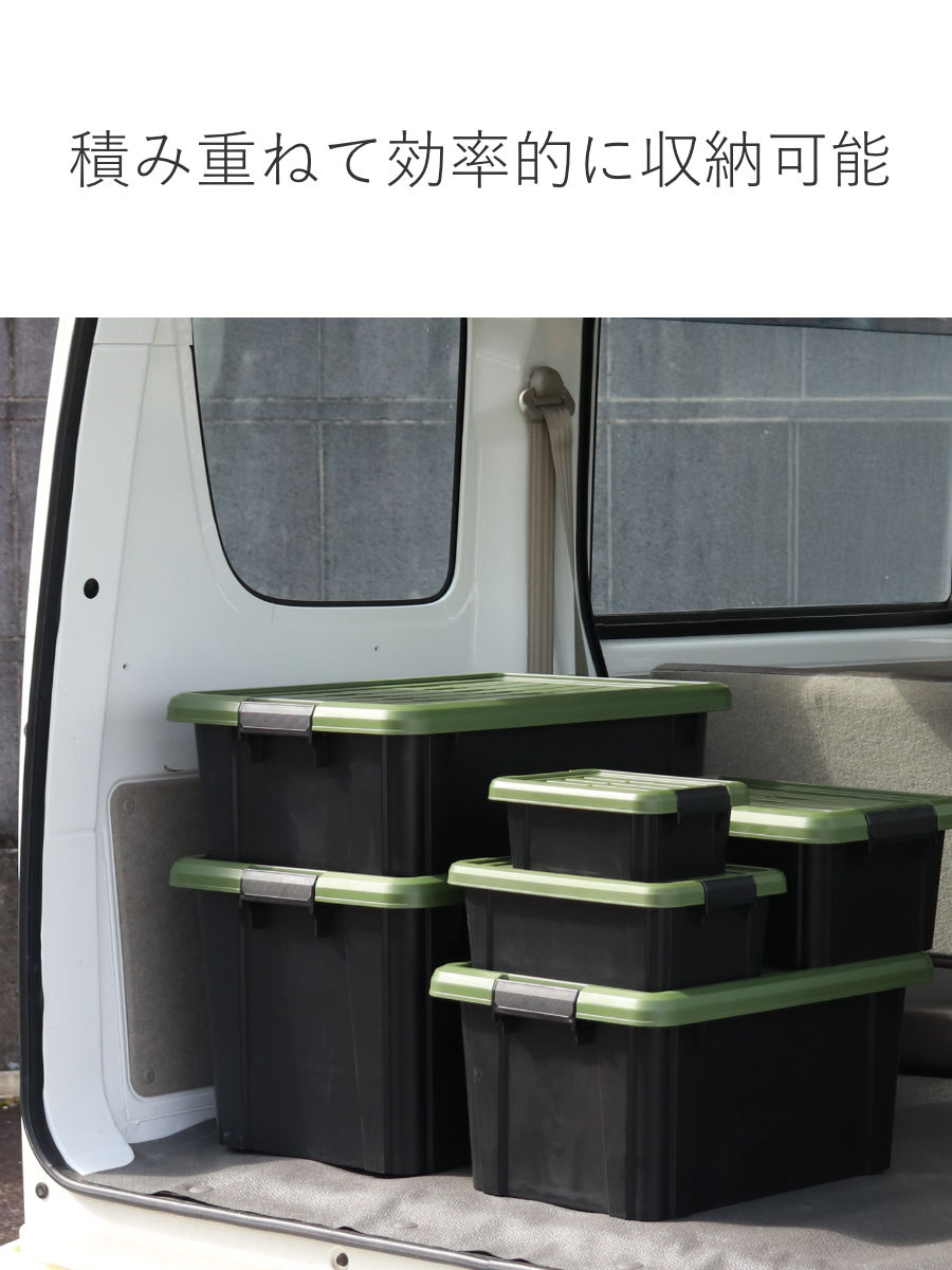 持ち運びに便利なコンテナケースは、キャンプなど屋外のアクティビティや、ガレージで使用する道具入れにするのもオススメです。フタが雨水や砂ぼこりの侵入を防ぎ、汚れてもサッと水洗いできます。