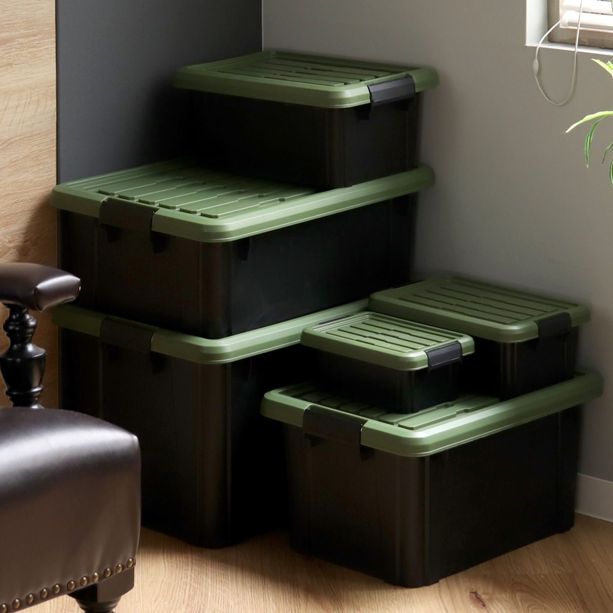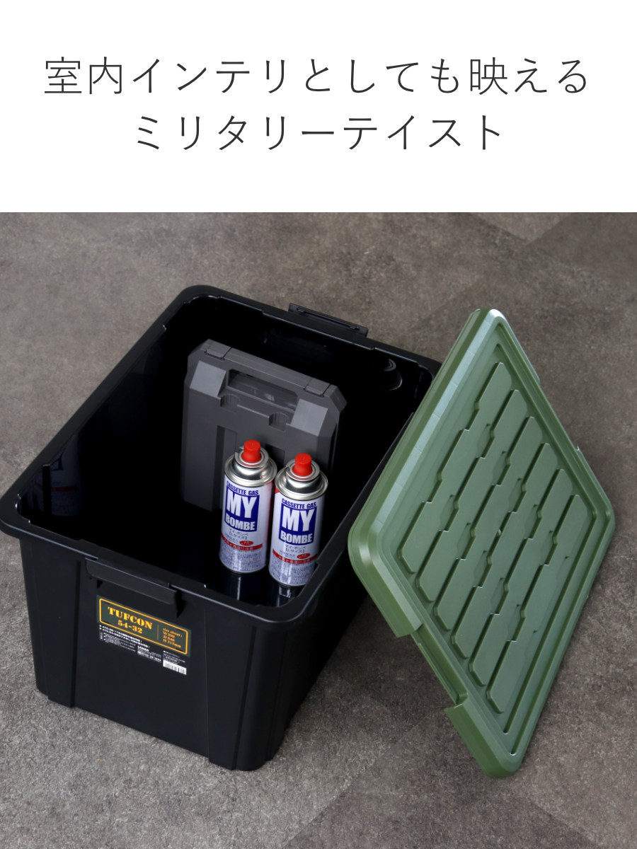 日用品や工具などを収納しておくのに便利な収納ボックスです。細かいものをざっくり入れてもフタを閉めることで生活感を隠すことができます。ミリタリーテイストなデザインでリビングやキッチンなど見えるところに置いてもスタイリッシュさを保てます。