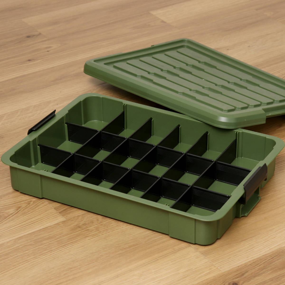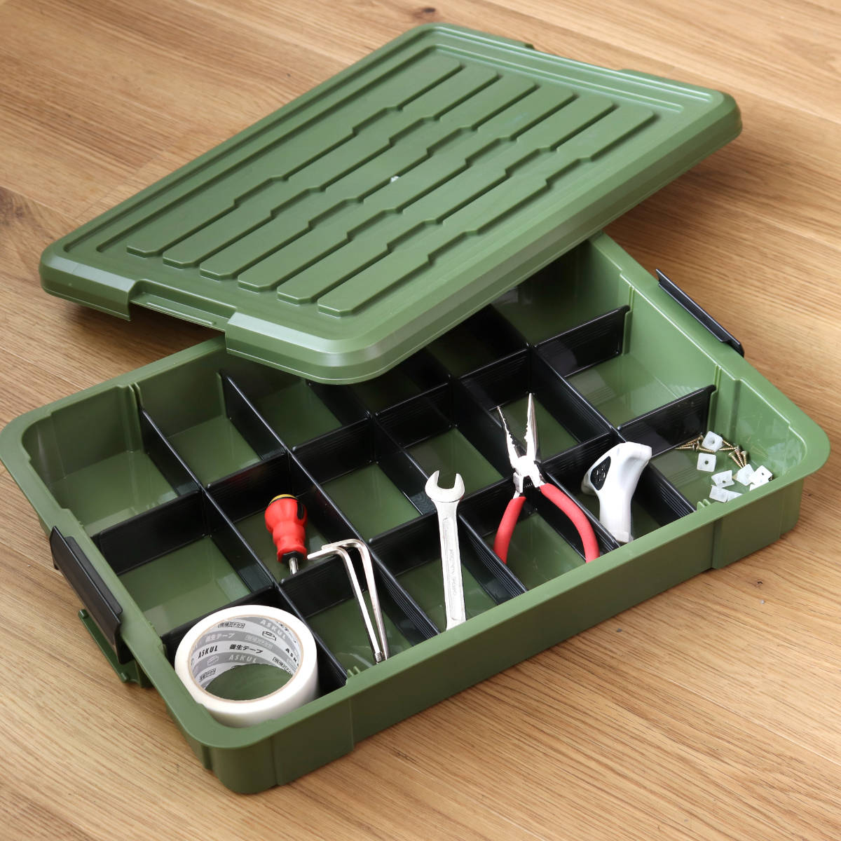 便利な仕切板がついているのでネジや電池などの細々とした工具や文具、釣り具類を整理してスッキリ収納することができます。ゆとりあるサイズで収納の幅も広がります。