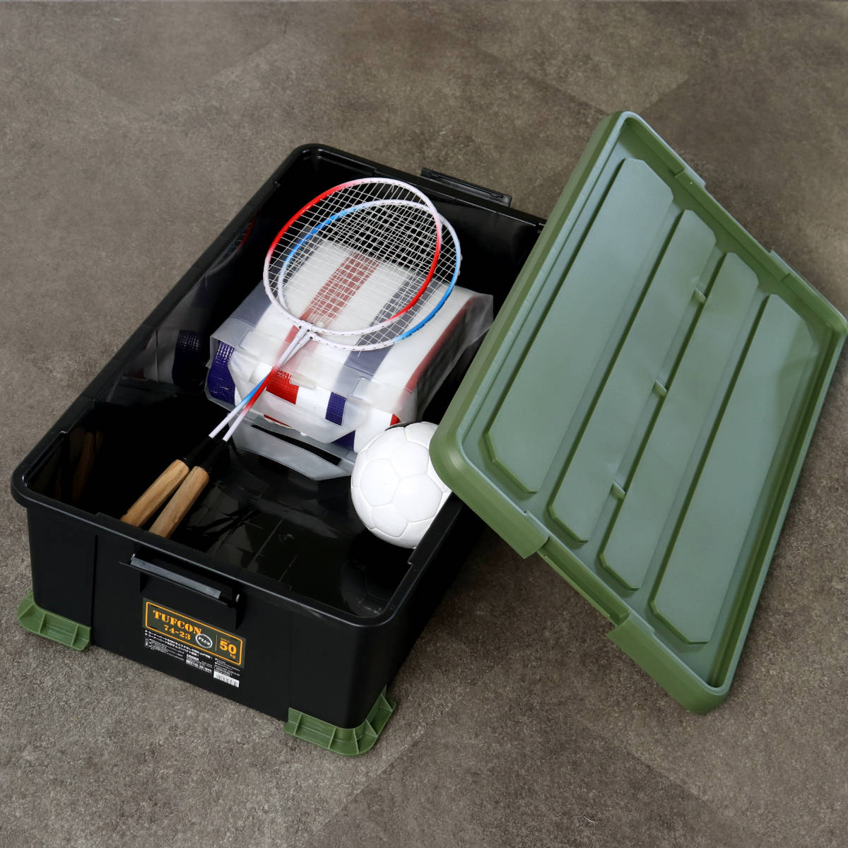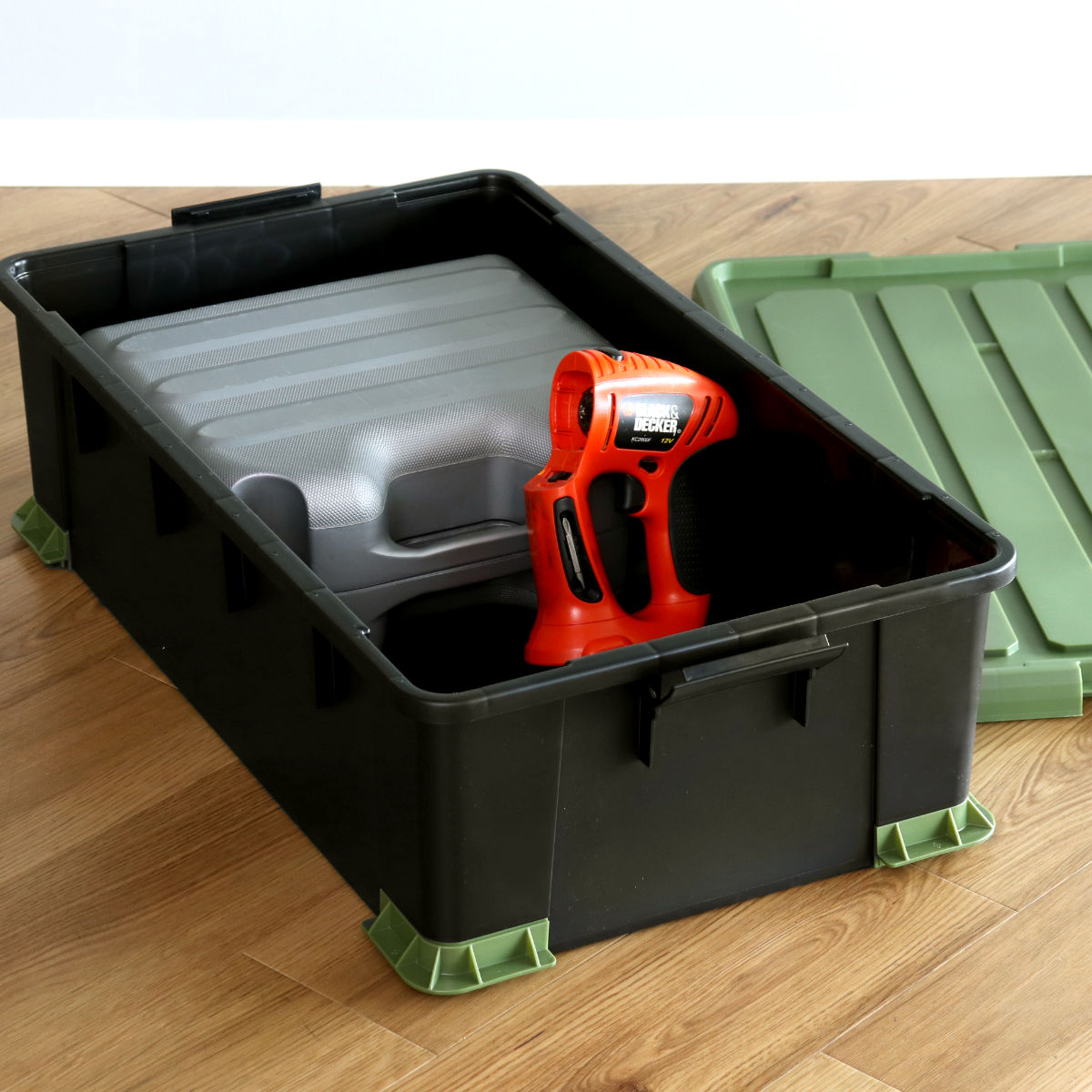持ち運びに便利なコンテナケースは、キャンプなど屋外のアクティビティや、ガレージで使用する道具入れにするのもオススメです。フタが雨水や砂ぼこりの侵入を防ぎ、汚れてもサッと水洗いできます。