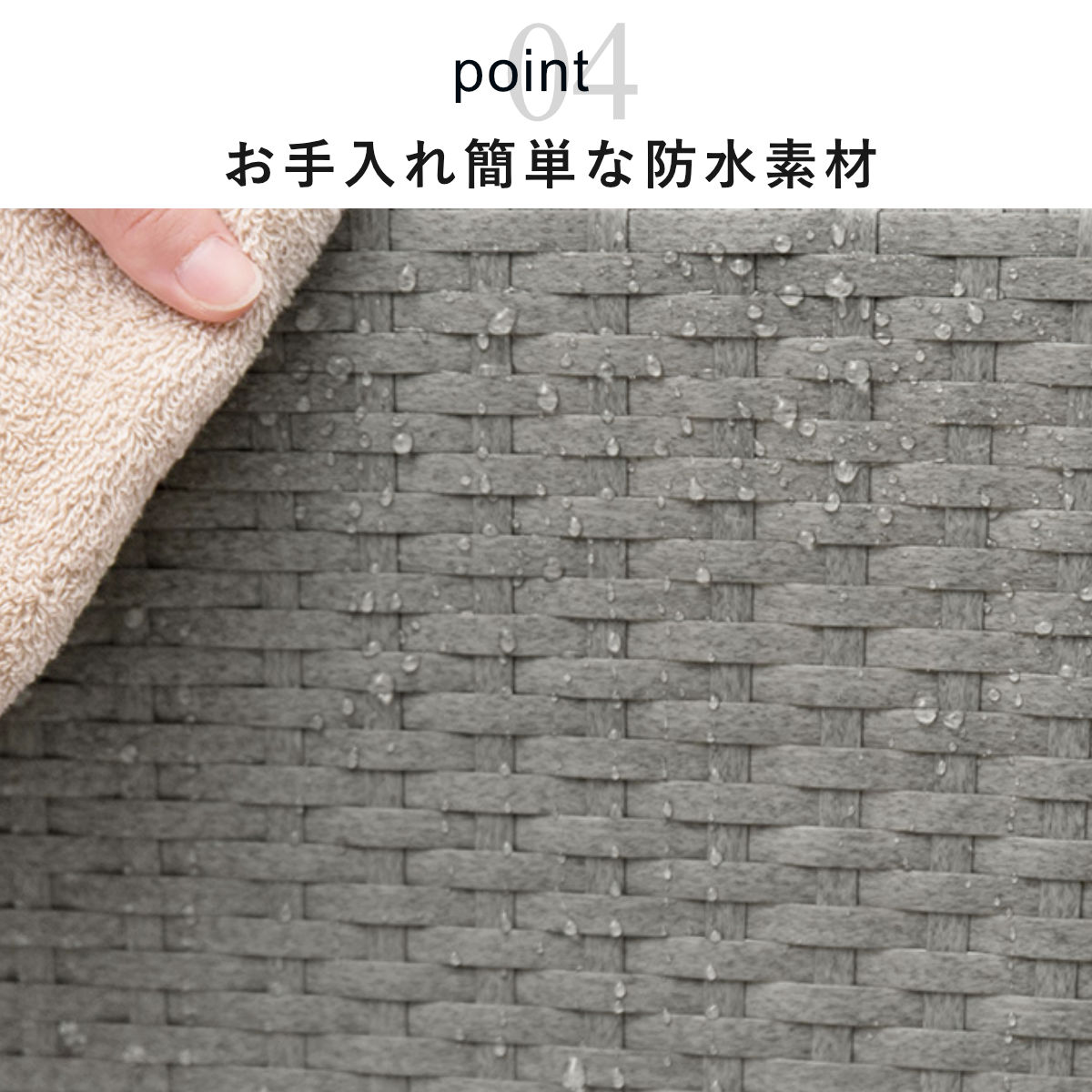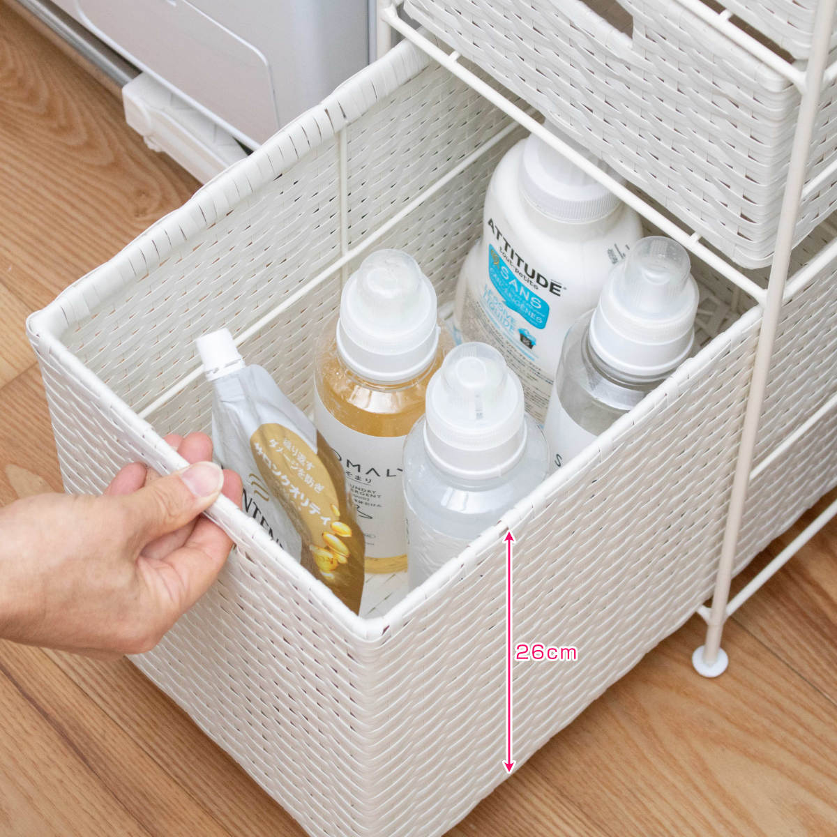 水や汚れに強い樹脂製で、お手入れもラクです。通気性の良いラタン調のデザインで、衣類やタオルの収納にもピッタリです。