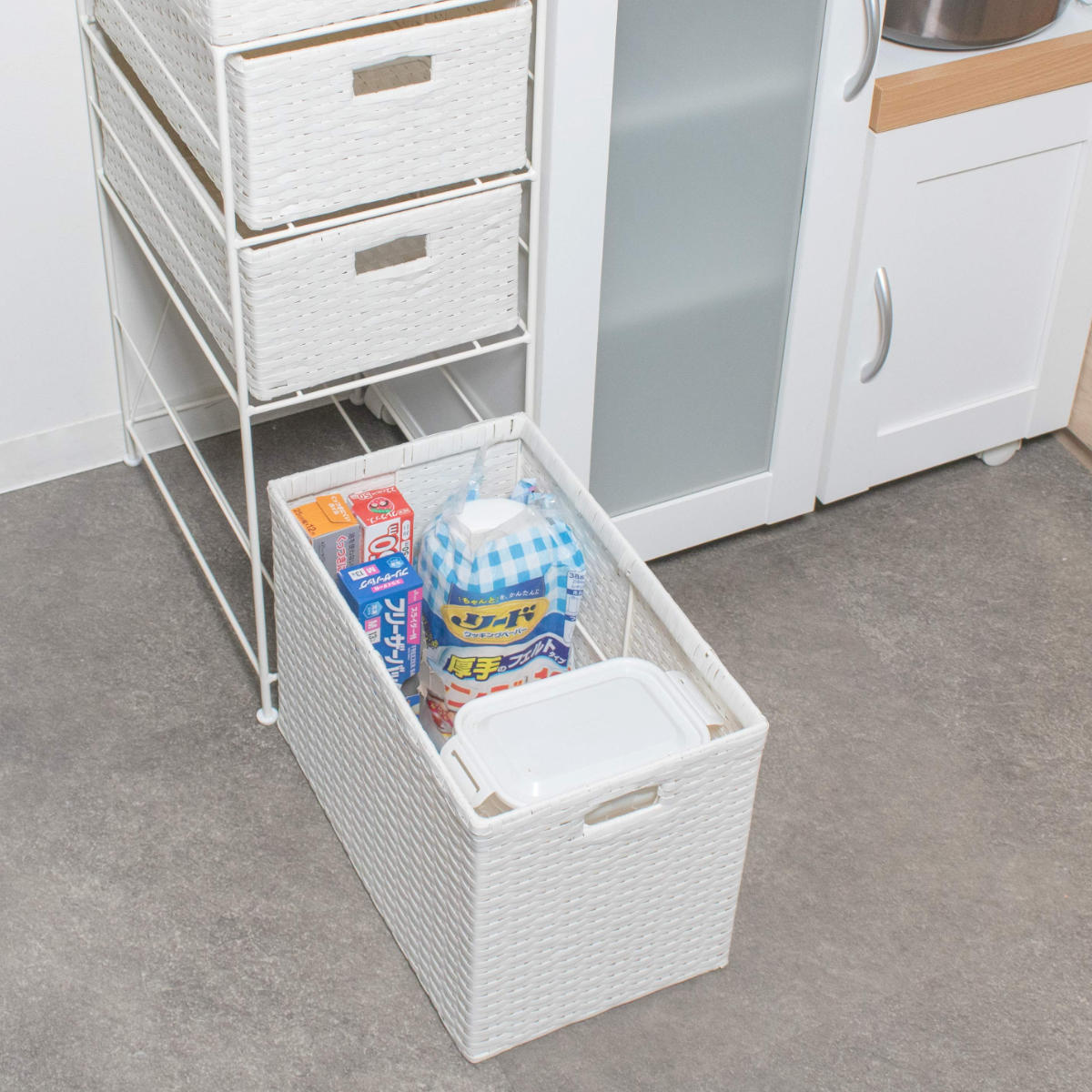 洗面所だけでなく、キッチンラックとしてもお使いいただけます。通気性がよいので、根菜類などのストック収納にもおすすめです。