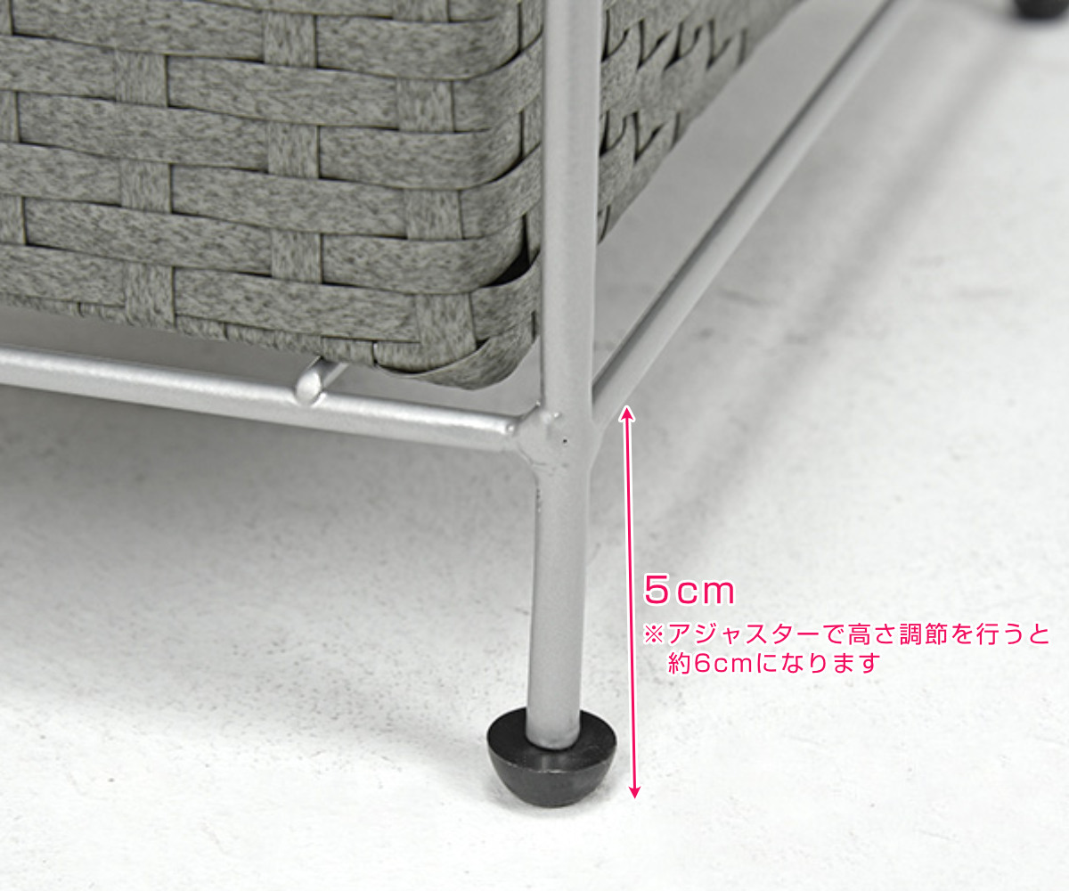 脚部はアジャスター付きで、床の凹凸や傾きによるガタつきを軽減し、約1cmの高さ調節が可能です。