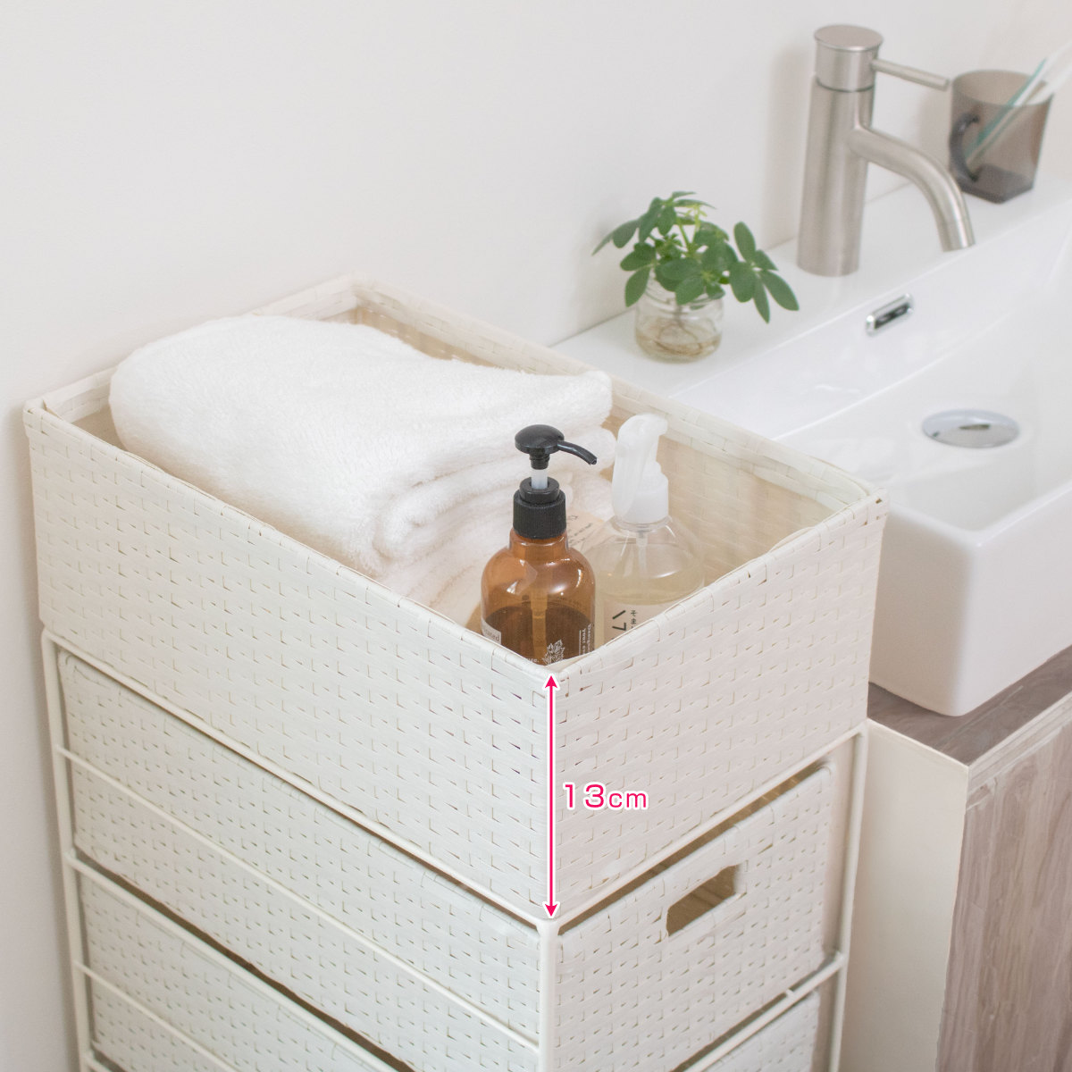 着替えや洗剤、ドライヤーなど、ちょい置きしたい物にちょうどいい天板付き。深さ約13cmのカゴ型なので、置いた物が落ちにくく安心です。