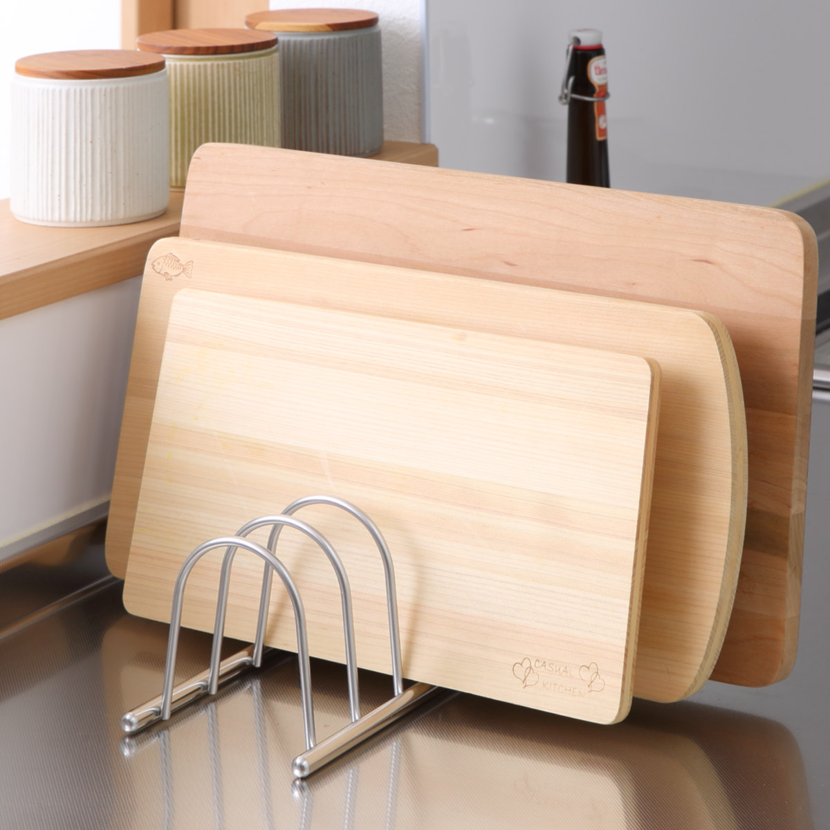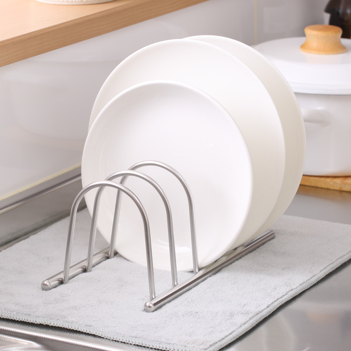 まな板やお盆、保存容器のフタなどのスタンドとしてもおすすめ。種類ごとに分けて整理整頓ができます。