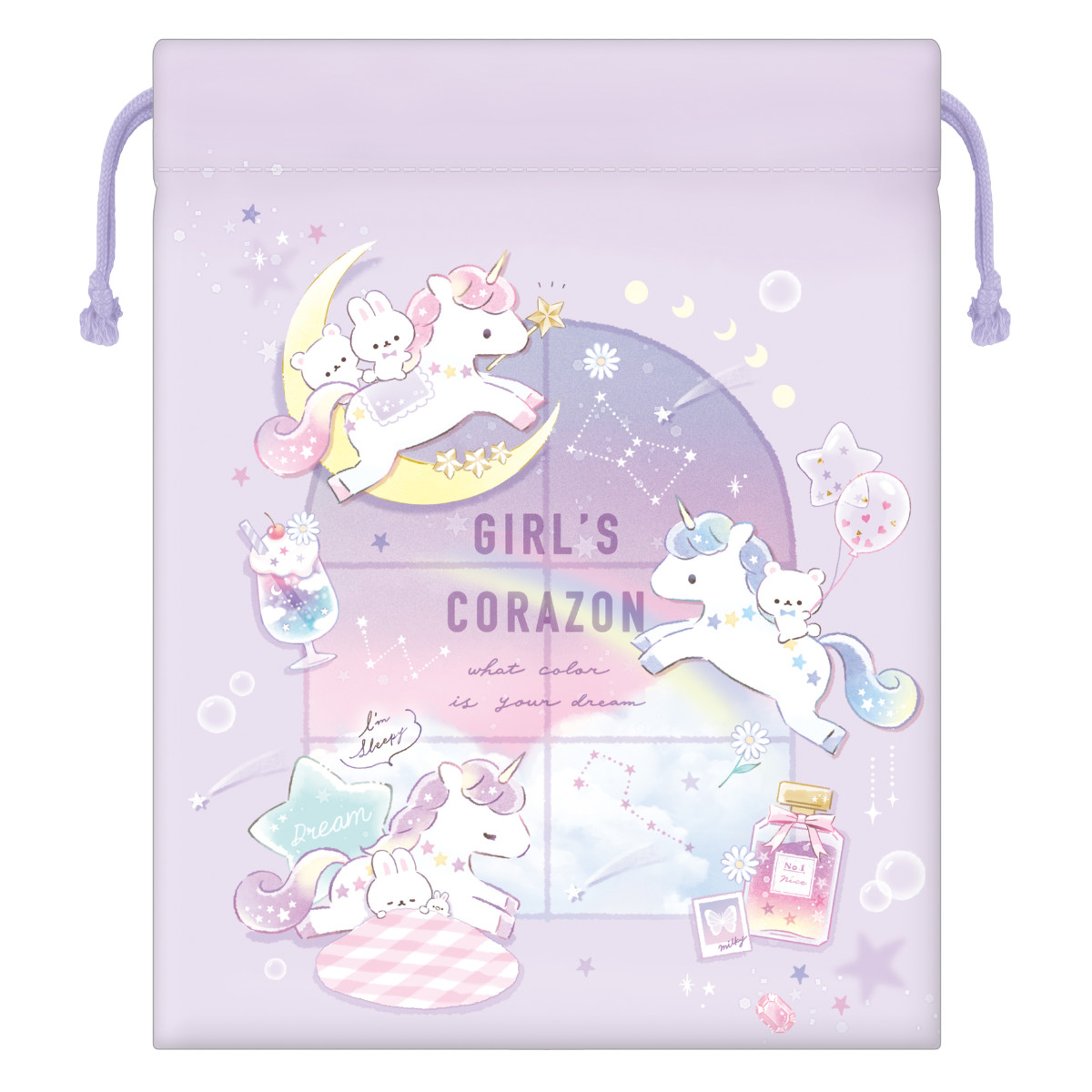 ●やさしいカラーとゆるいキャラクターに癒されるマチ付きの巾着袋です。