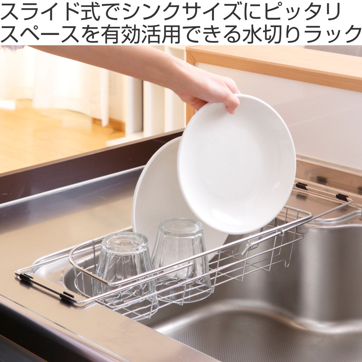 シンクの大きさに合せて伸縮できるアームがついているので、ご自宅のシンクにぴったりフィットします。水が直接シンクに落ち、水受けが不要なのでお手入れが簡単で衛生的です。