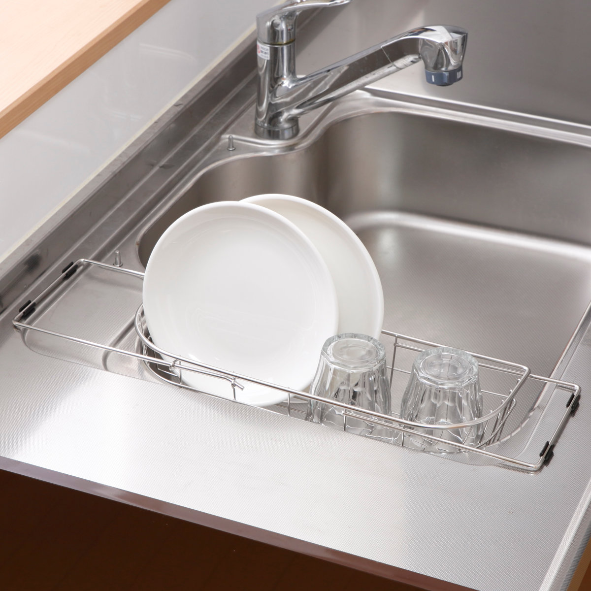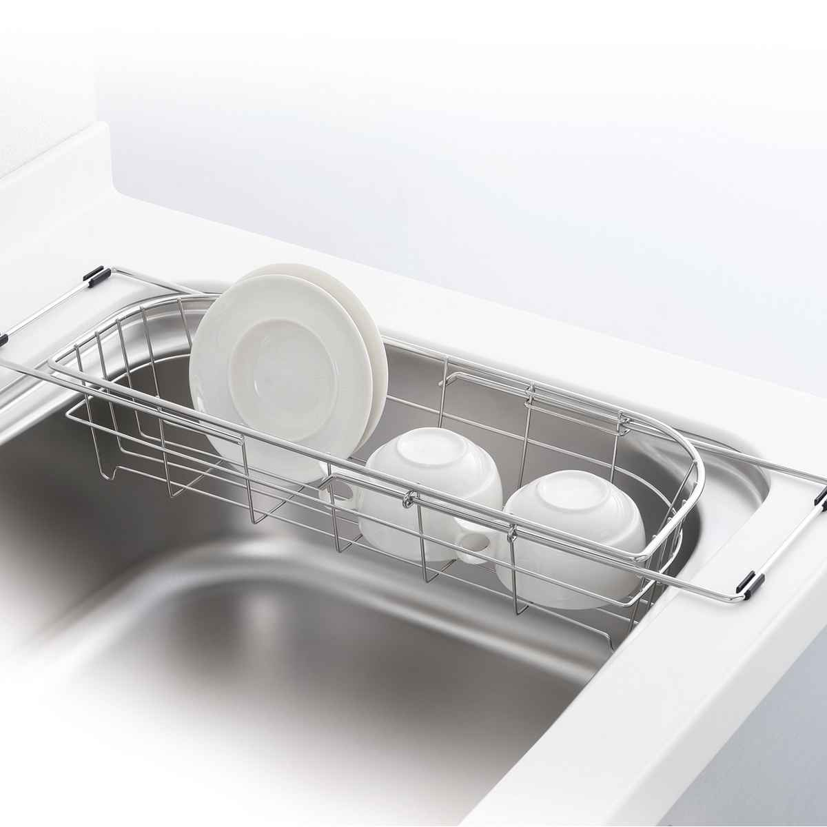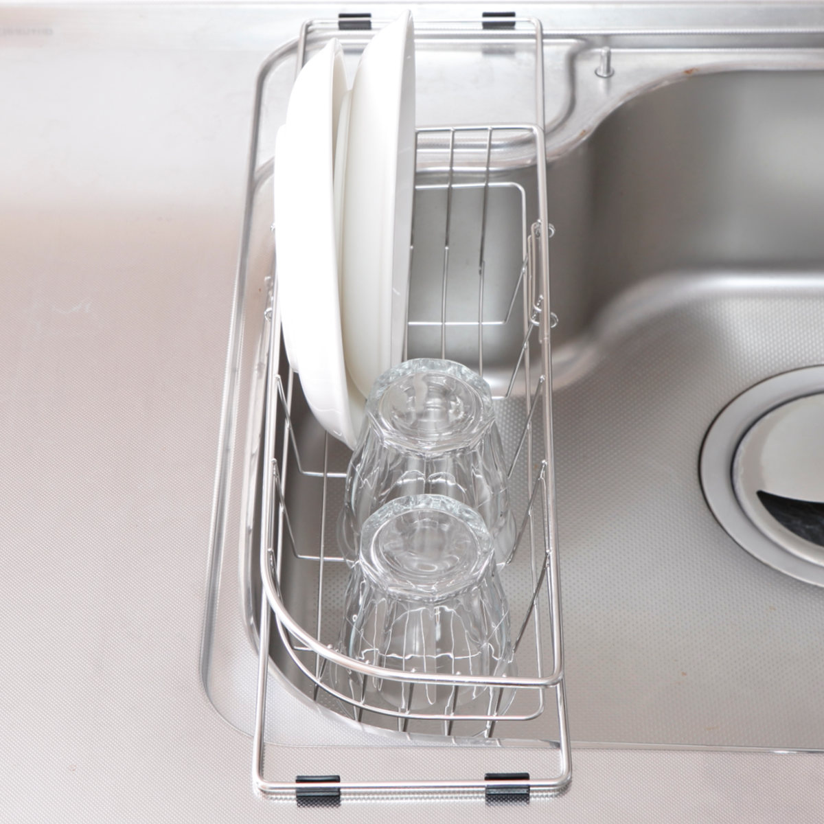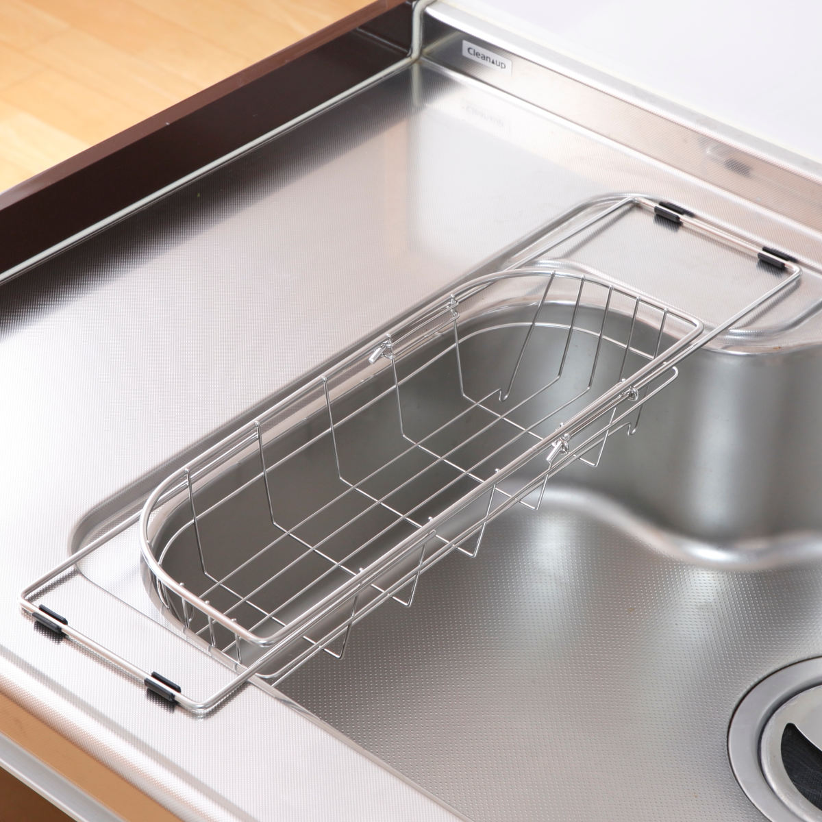 角はカーブ形状となっており、シンクの端にぴったり沿わせて設置できます。きっちり端まで寄せられるので、無駄なスペースを作らずシンクを広く使えます。