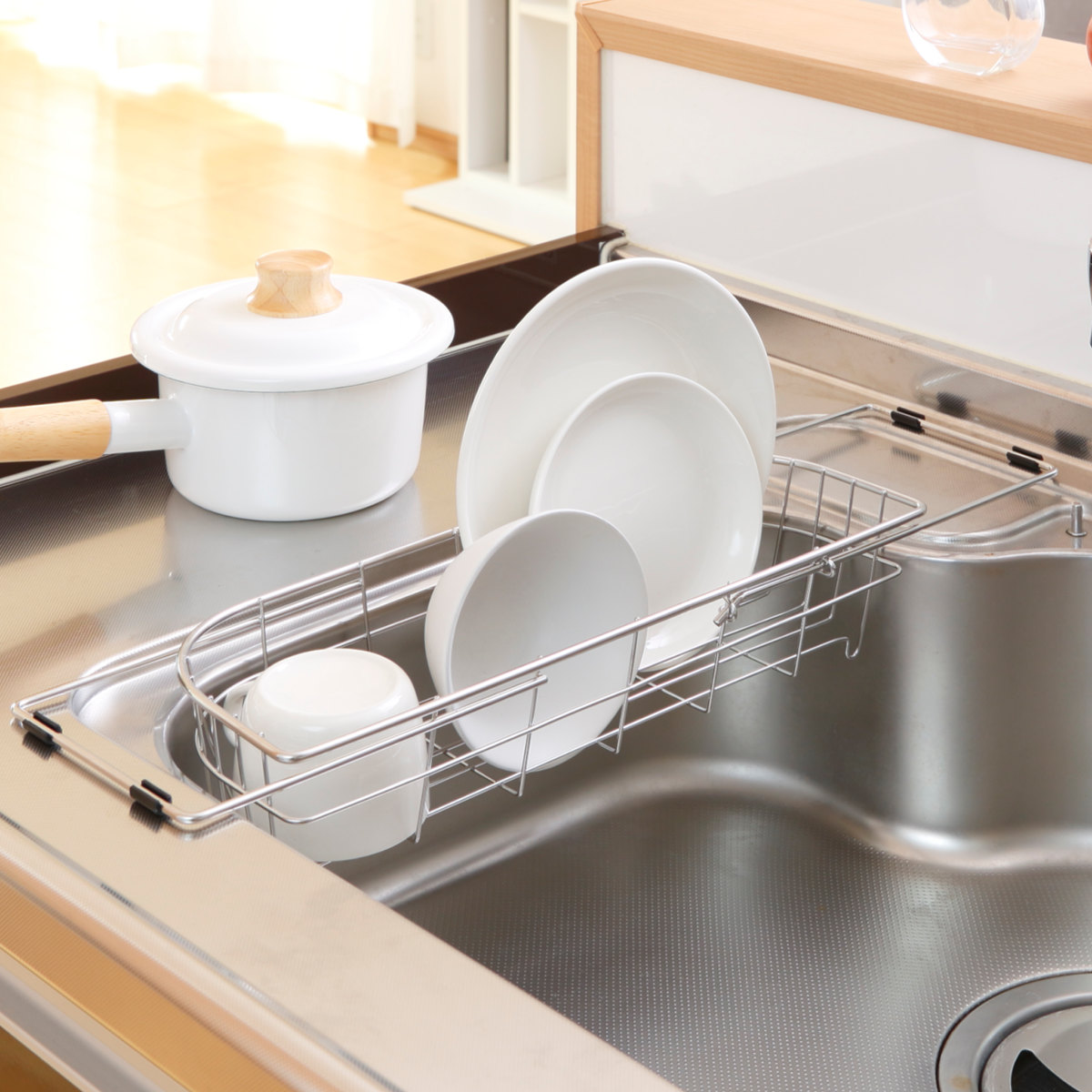 コンパクトなキッチンでもスペースを有効活用して使える水切りかごです。シンクに掛けて水切りができるので、作業スペースを広く使うことができます。食器や調理器具のちょっとした水切りにピッタリです。