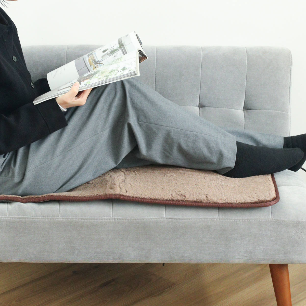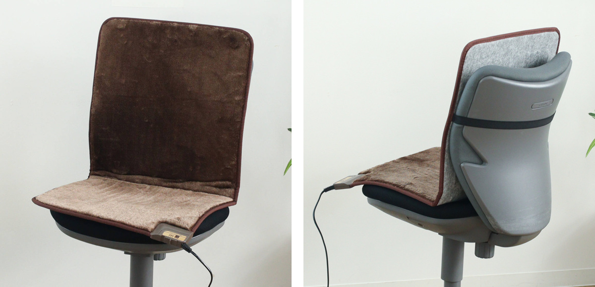 デスクチェアに敷けば、腰や背中をじんわりあたためます。固定バンドが付いているのでズレる心配もありません。長時間座る作業や食事の時間も、心地よいぬくもりで快適に過ごせます。