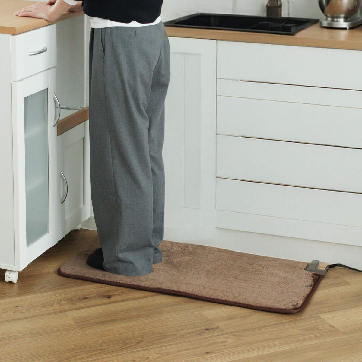 キッチンの足元に敷くだけで、冷えやすい床からの冷気をしっかりガード。料理や洗い物の時間も、足元がじんわり暖かく快適に過ごせます。