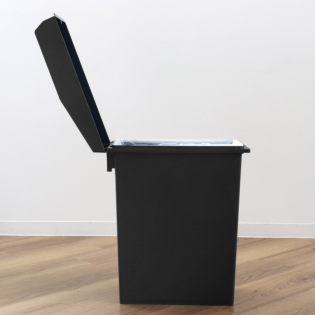 ふたは山型に折りたたまれながら開くため、開閉時も高さを取りません。棚下やカウンター下など、高さに制限のある場所にも無理なく配置できます。