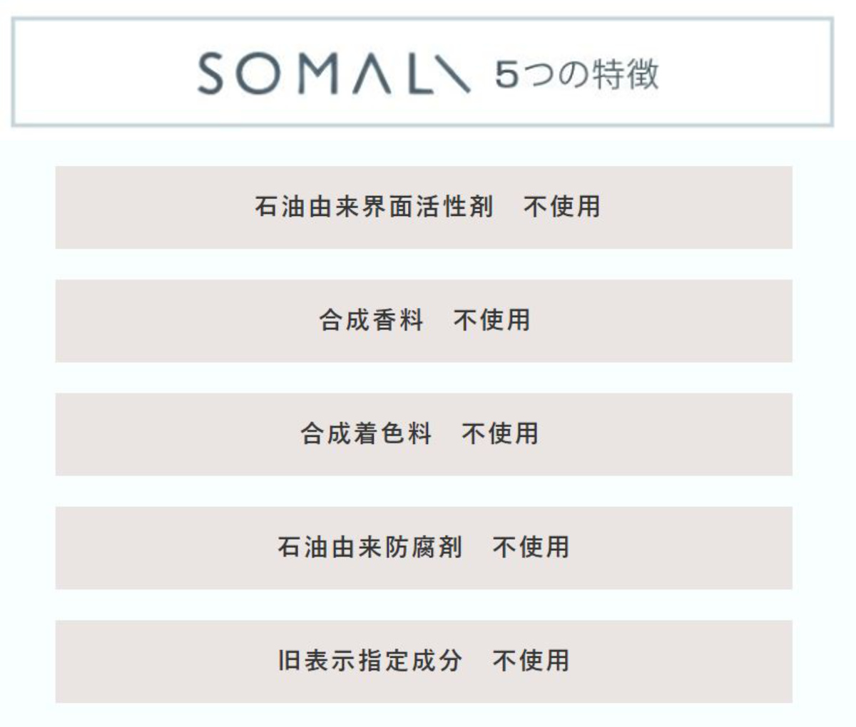 一般的な洗剤やボディ洗浄剤に使われている5つの成分を排除し、天然素材にこだわっています。香りには、天然精油を使用し、旧表示指定成分は使用していません。
