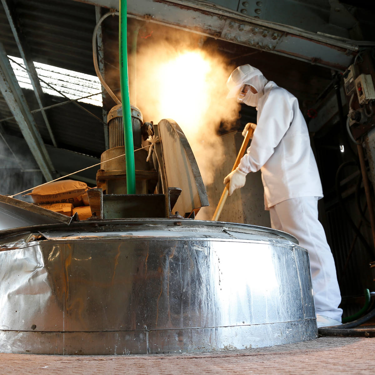 SOMALIのような天然素材から石けんを作るには必要不可欠な釜焚き法。職人が目や舌で確かめながら高温の釜を一日焚き続ける過酷な方法です。手間も時間もかかりますが、何種類もの脂肪酸が絶妙なバランスで混ざり合い、質の良い石けんができあがります。
