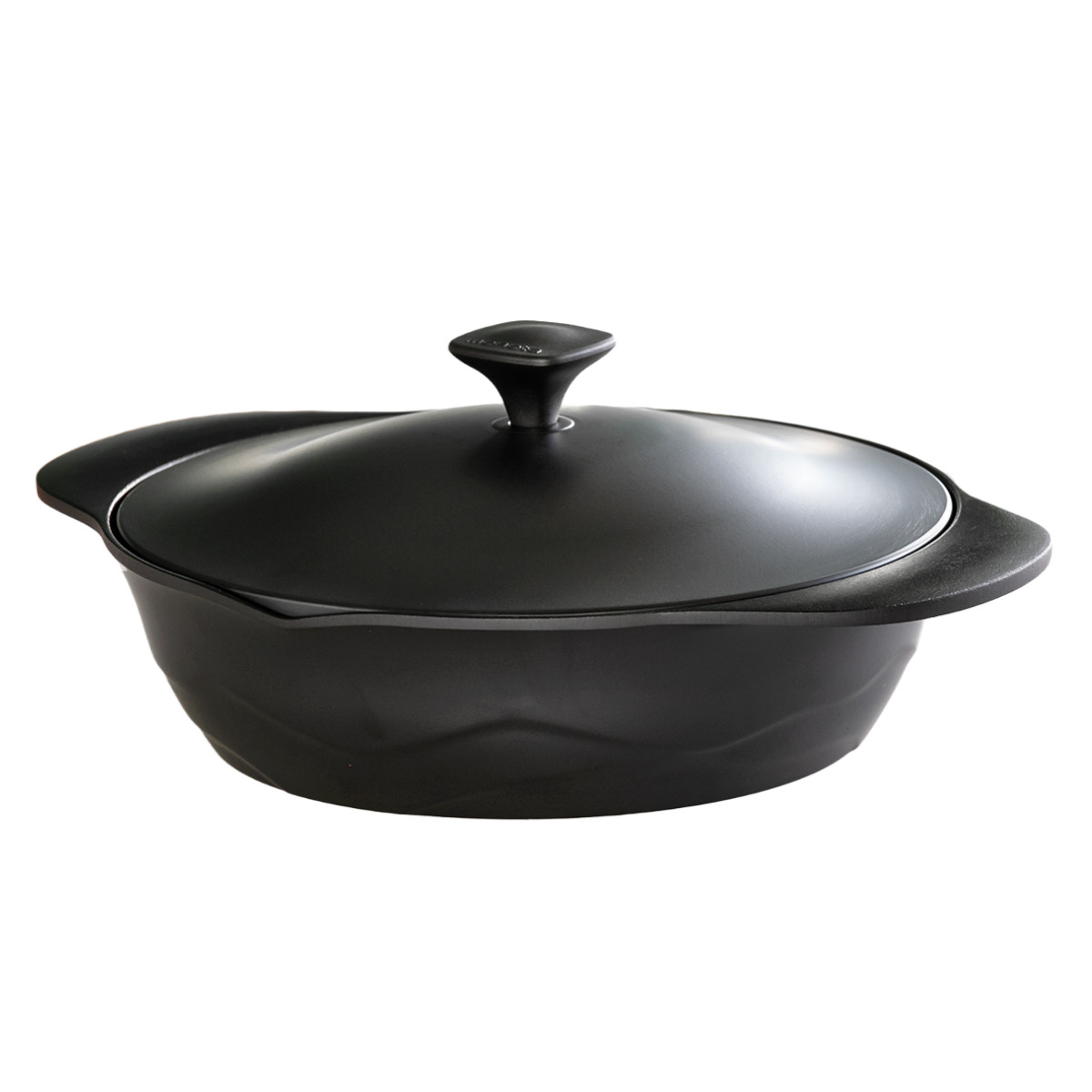 料理がひときわ映えるオールブラックカラーのスタイリッシュで無駄のないデザインです。アルミダイキャストならではの革新的な形状で、本体と取っ手が一体型になっており、継ぎ目がないのでお手入れも簡単です。