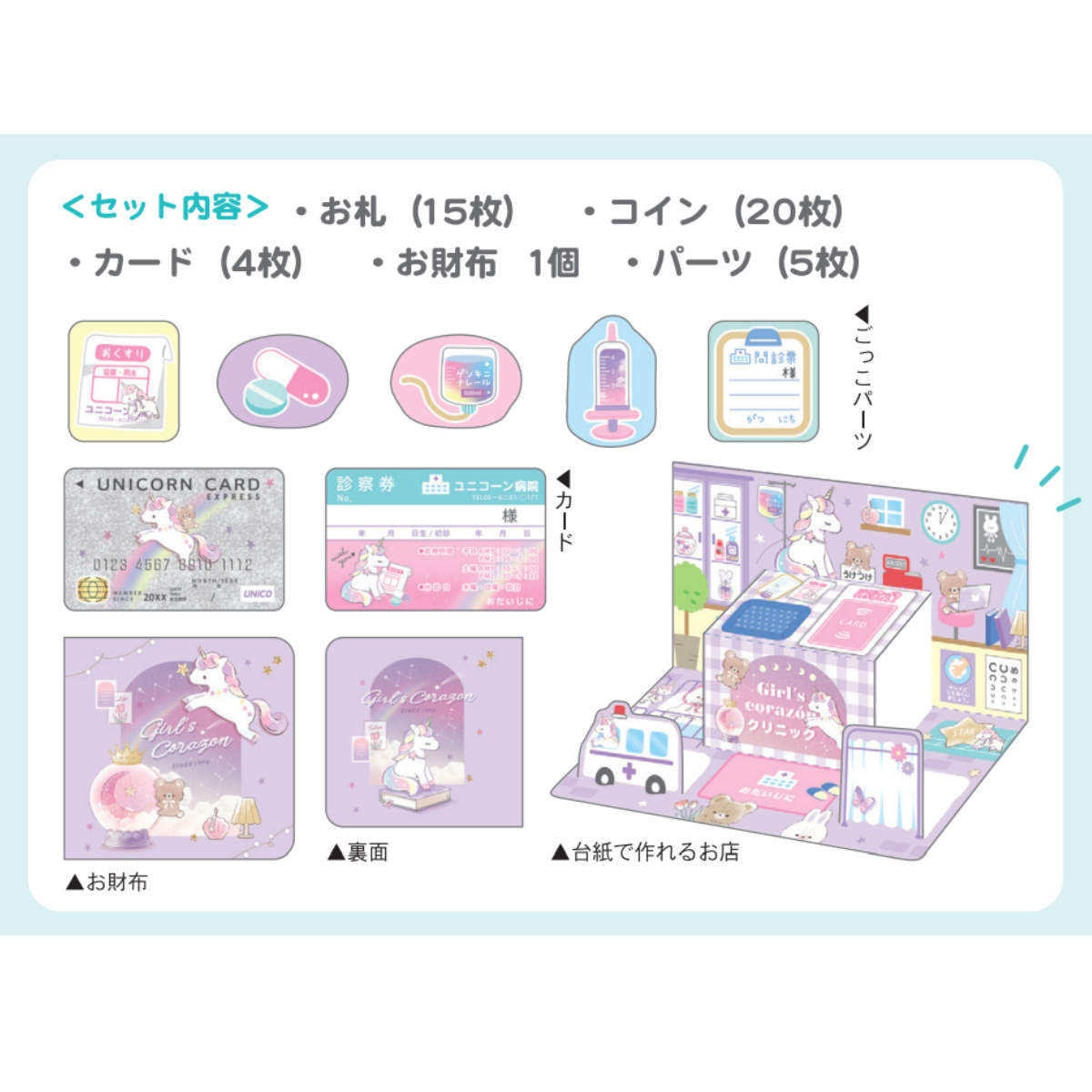 おもちゃのお金を使って、楽しくごっこ遊びができるセットです。おもちゃのお金で遊びながら数の勉強や、お金の価値を知る社会勉強にもなります。台紙でお店を作れるので、注射やお薬などのパーツを並べてびょういんごっこが楽しめます。