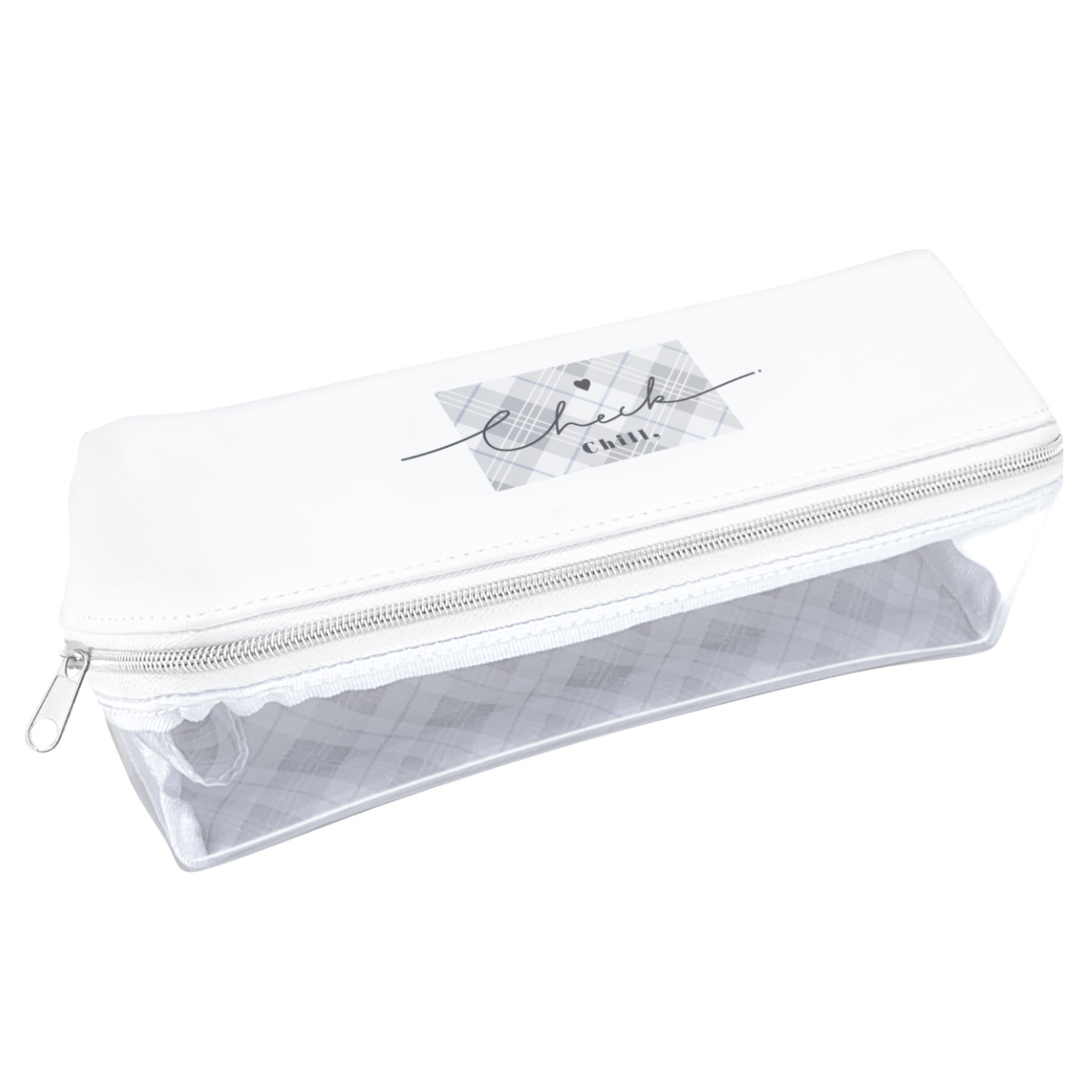 下部分がクリア素材で、ほどよく中身を見せられるペンケースです。大きく開くファスナーで中身も取り出しやすいです。内側のチェックプリントと乳白色がアクセントになった可愛いデザインです。