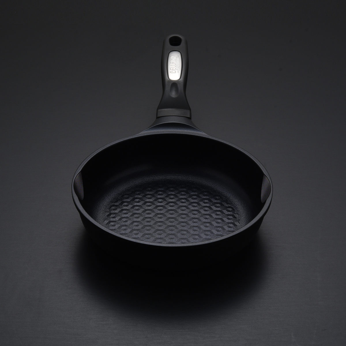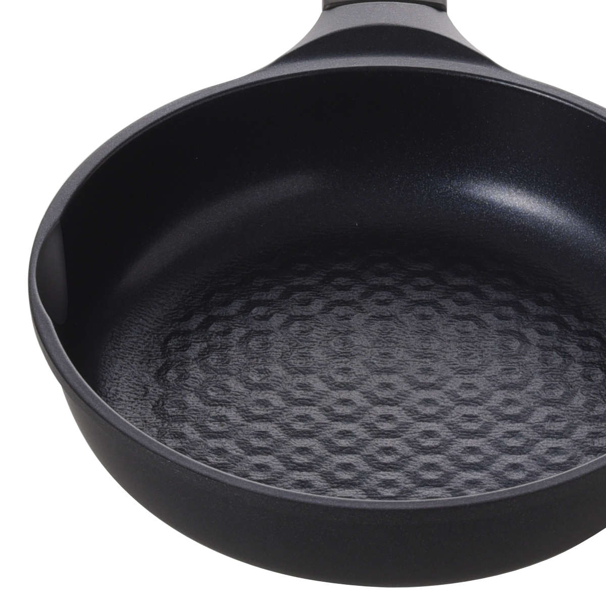 底面全体に広がった溝と窪みが食材自体の油や水分をまんべんなく広がらせ、六角形の山の山頂が食材に線で接することで食材をこびりつきにくくします。このファインスクラッチ加工により、食材の油がなじみやすくなり、コーティングの密着性もアップします。