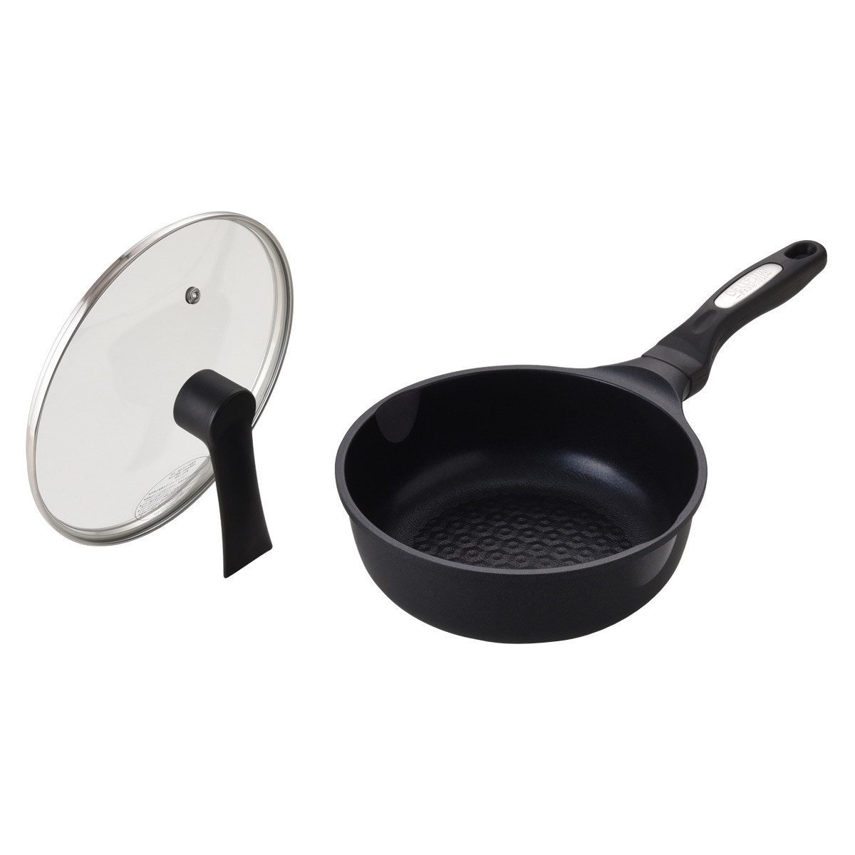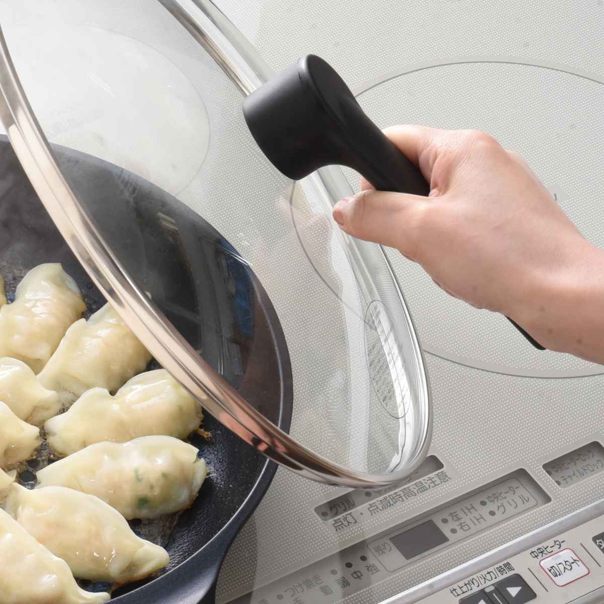 フライパンにピッタリ合うガラス蓋が付属しています。サイズに合った蓋をすることで、ガタつかず、中までしっかり火を通すことができます。取っ手は、フェノール樹脂製で熱くなりにくく、持ちあげやすいハンドルデザインです。