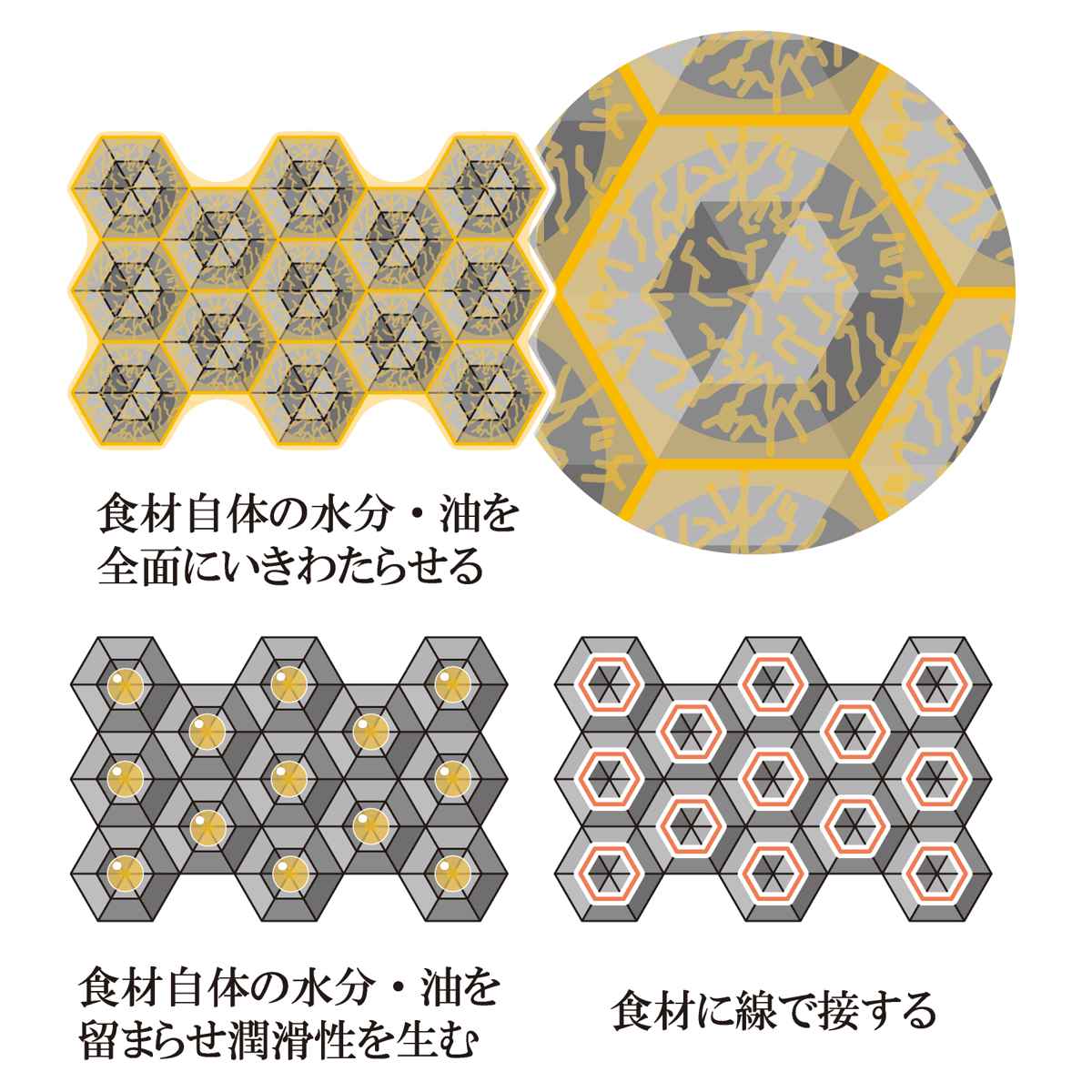 底面全体に広がった溝と窪みが食材自体の油や水分をまんべんなく広がらせ、六角形の山の山頂が食材に線で接することで食材をこびりつきにくくします。このファインスクラッチ加工により、食材の油がなじみやすくなり、コーティングの密着性もアップします。
