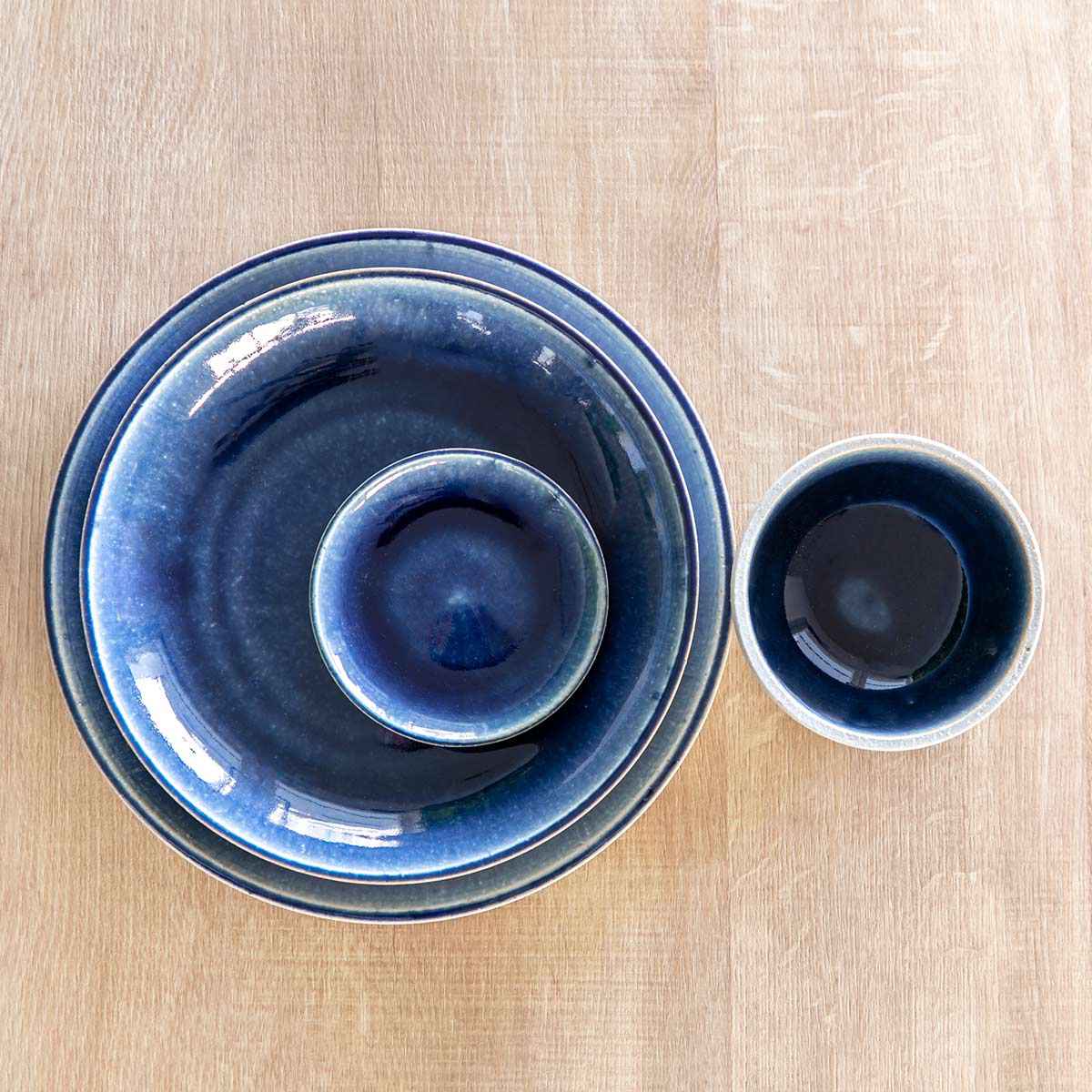 「BLOCK(ブロック)」シリーズは、大小のプレート、ボウル、カレー&パスタ皿の4つのラインナップです。組み合わせて使っていただくと統一感のあるテーブルコーディネートが叶います。ホワイトとブルーのコントラストが美しいので、色違いで揃えるのもおすすめです。