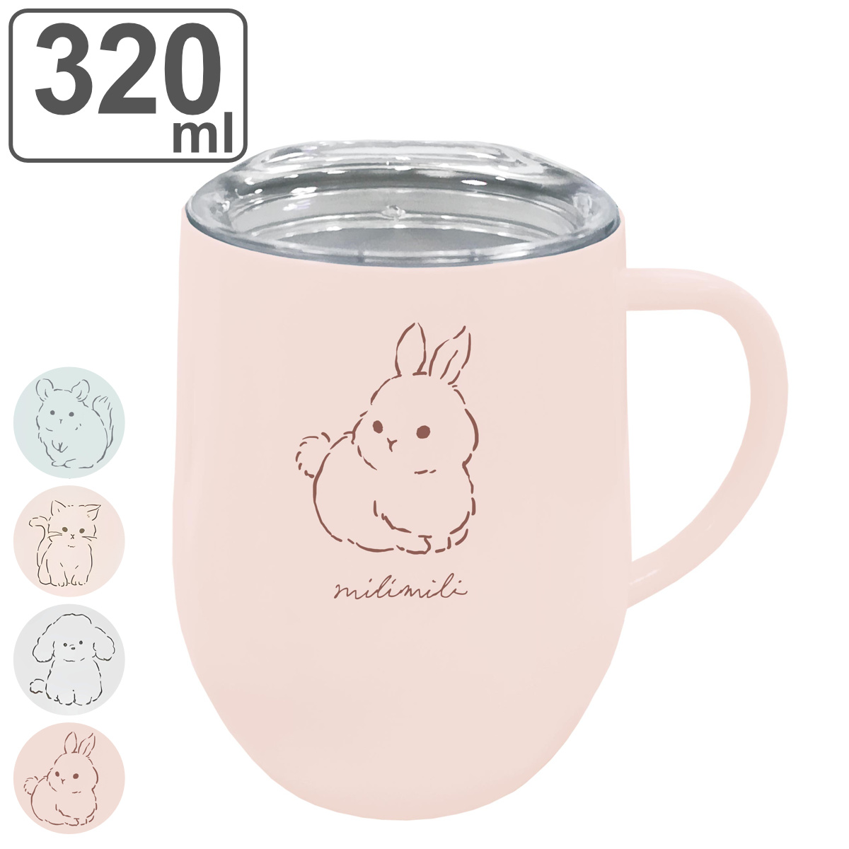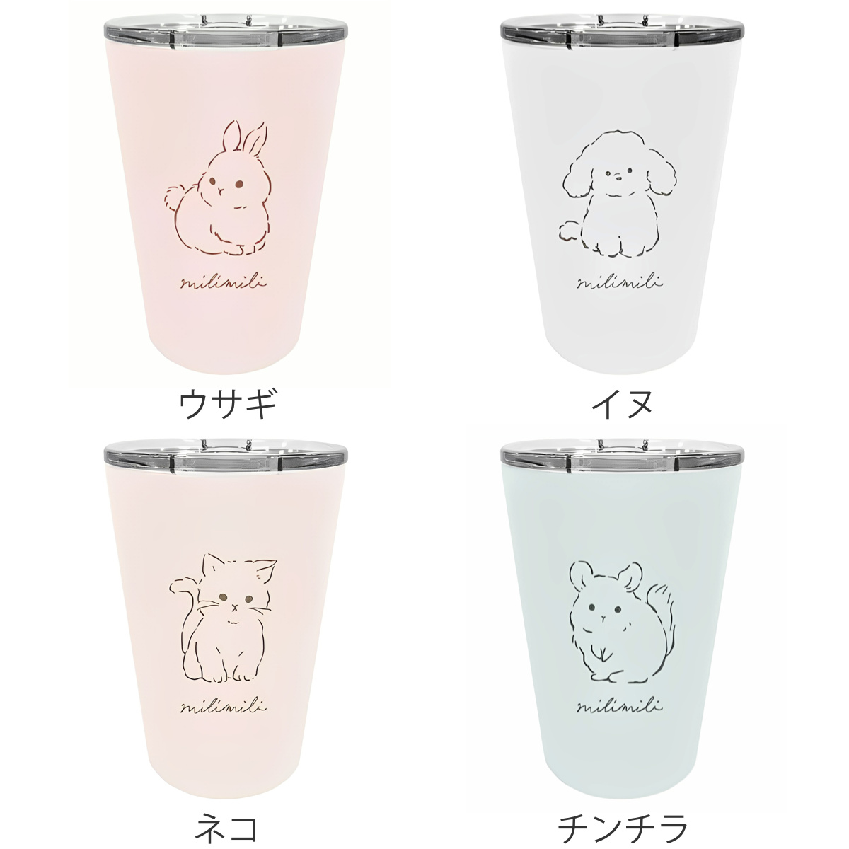 優しいニュアンスカラーのカップに、ふわふわのウサギ、イヌ、ネコ、チンチラのイラストがかわいい心が癒されるデザインです。