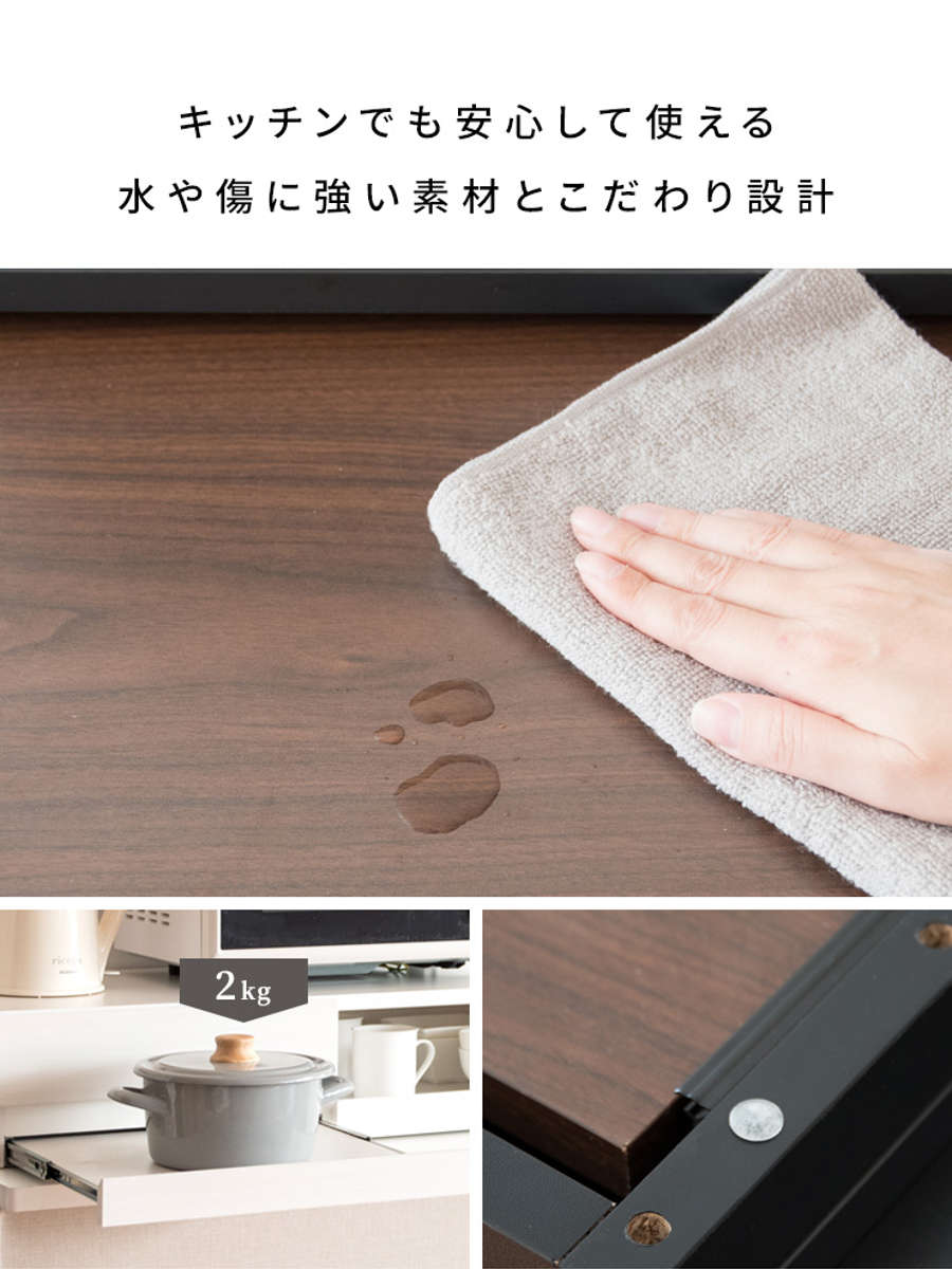 本体天板とトレー部分には、水や汚れ、傷に強いメラミン加工が施されています。濡れたり汚れたりしてもサッと拭くだけでキレイになり、お手入れが簡単です。