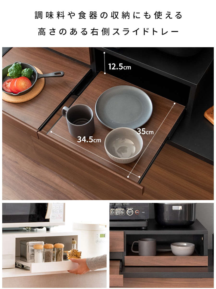 右側スライドトレーはトレー上の空間が高さ12.5cmあり、食器や調理器具のちょい置きはもちろん調味料やコップの収納としてもお使いいただけます。