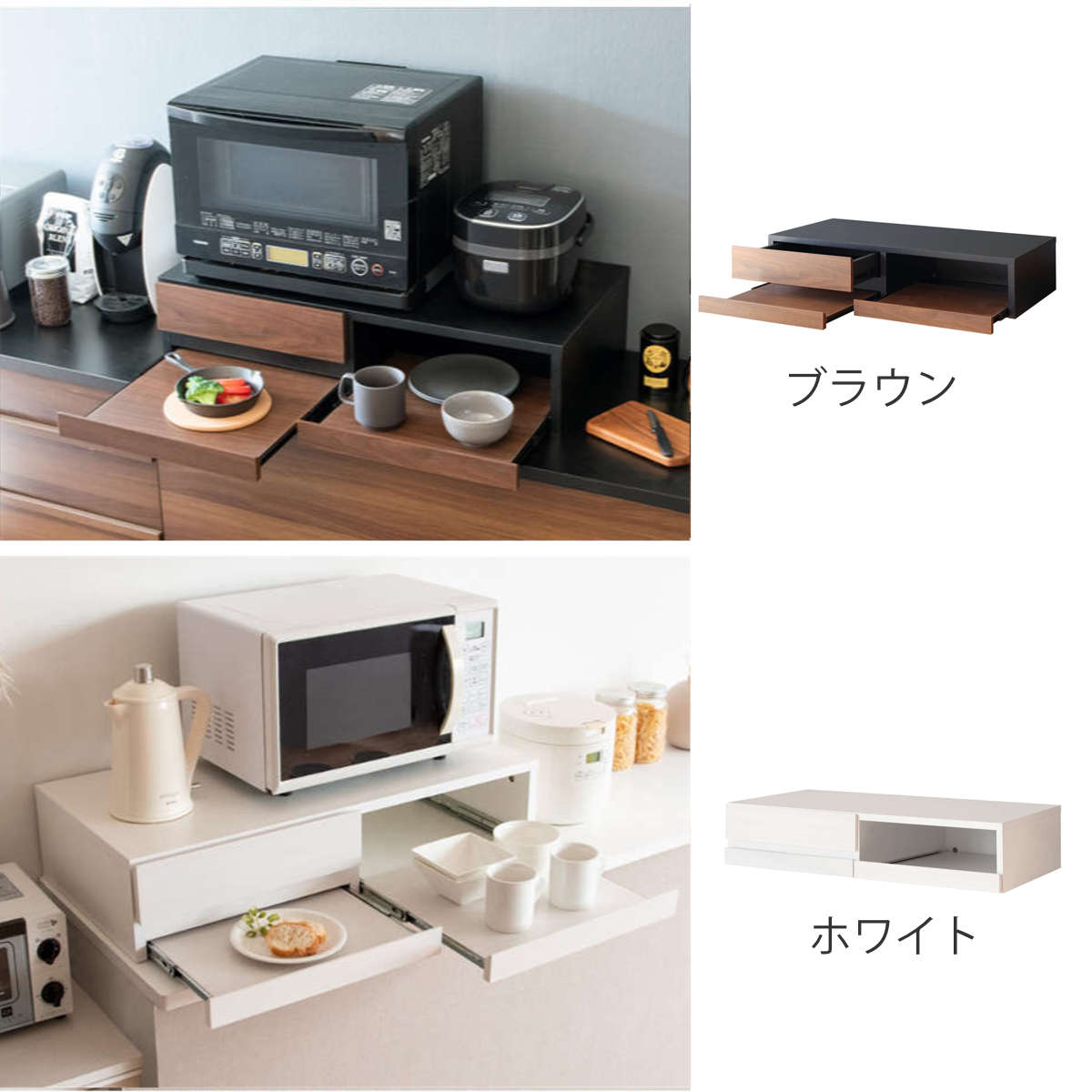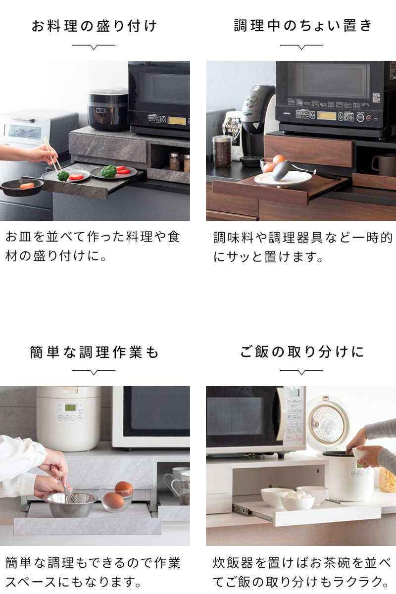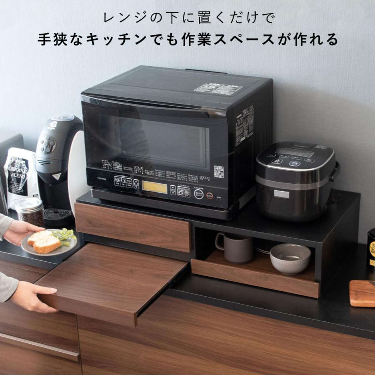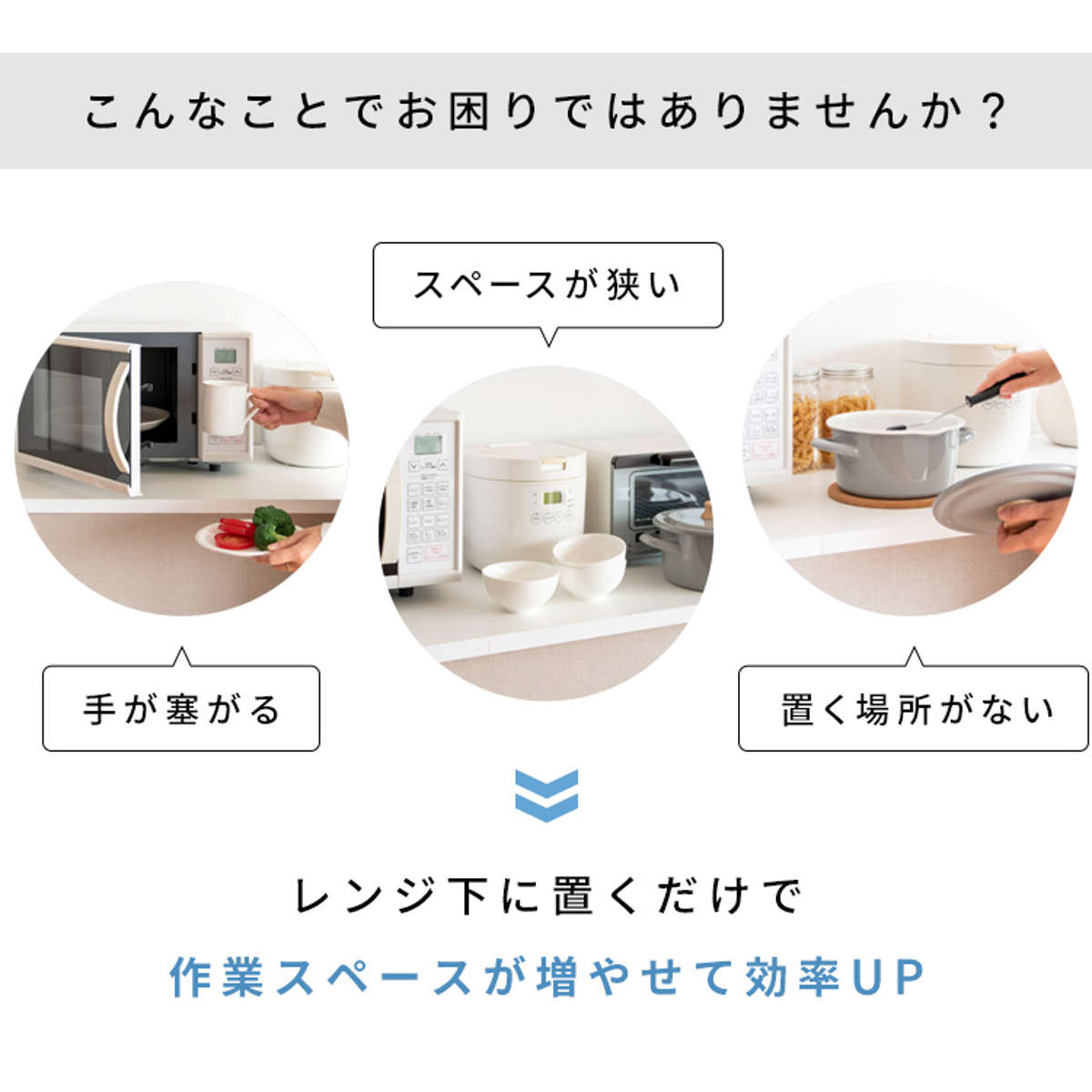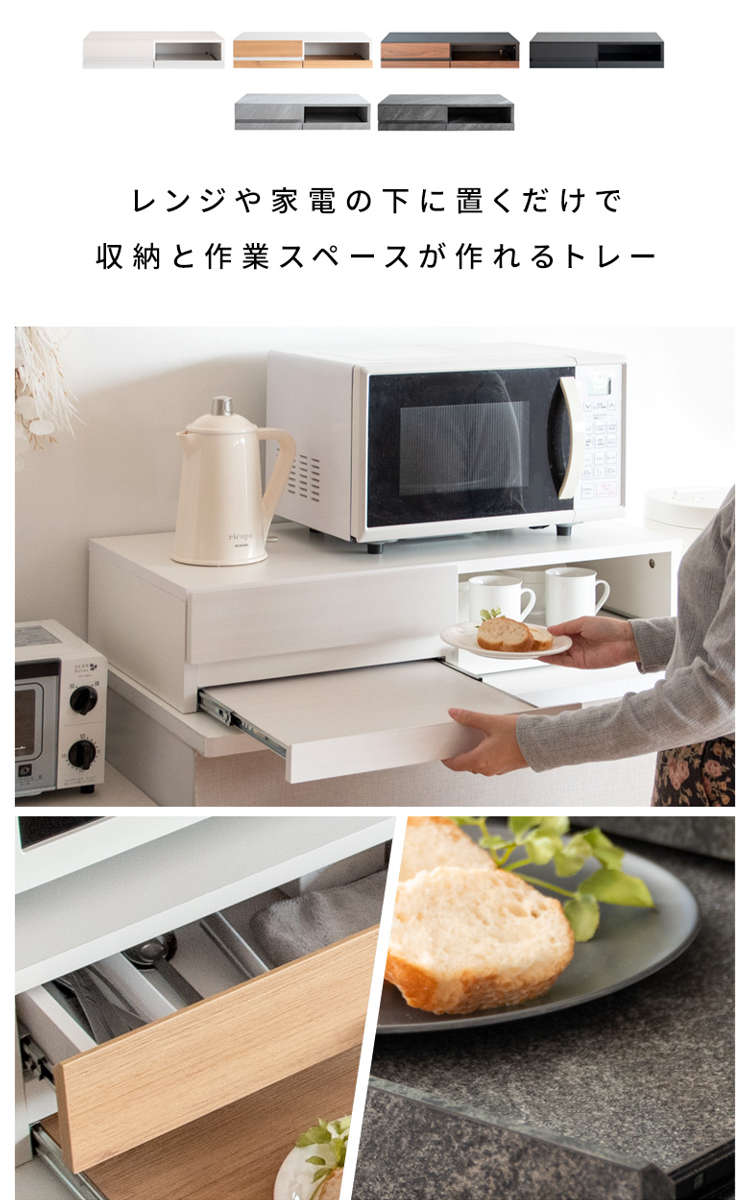 電子レンジや家電の下に置くだけで作業スペースが作れるレンジ下トレーです。