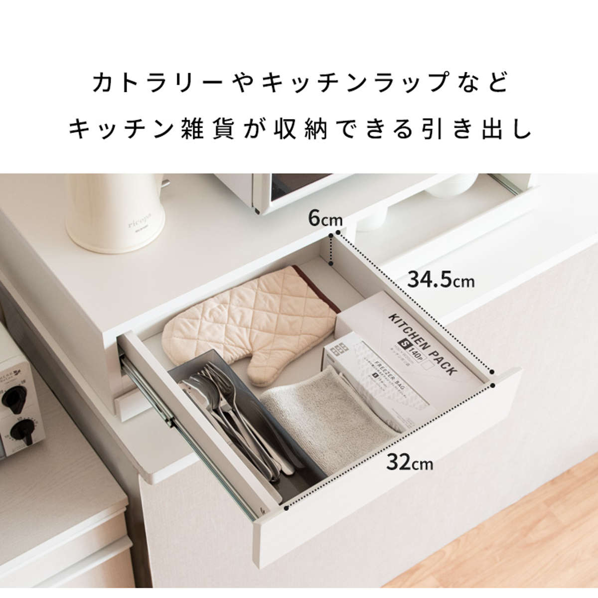 上部は引き出しになっていてキッチンに置きたいカトラリーやラップ、ミトンなどをまとめて収納できるのでキッチン周りがすっきり片付きます。