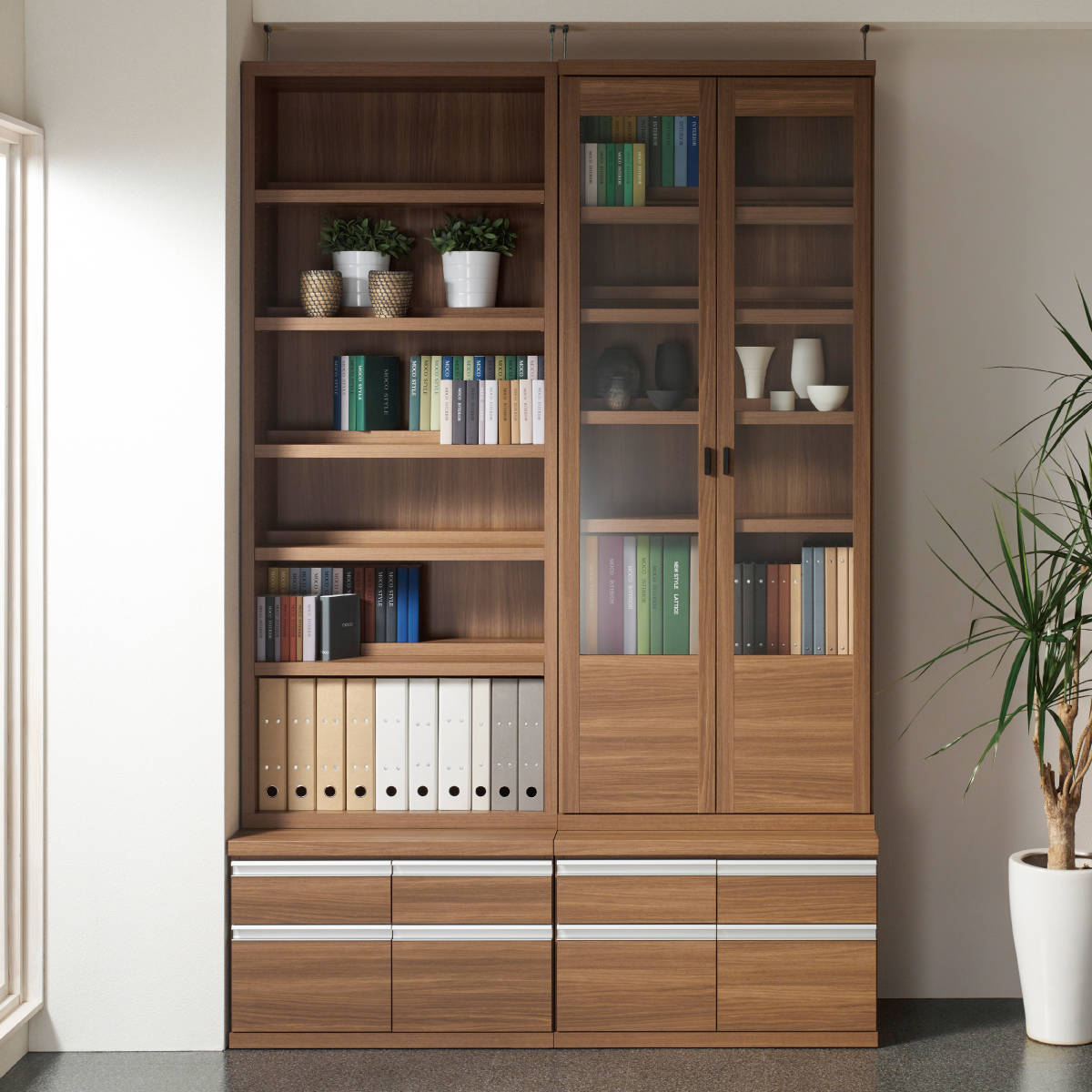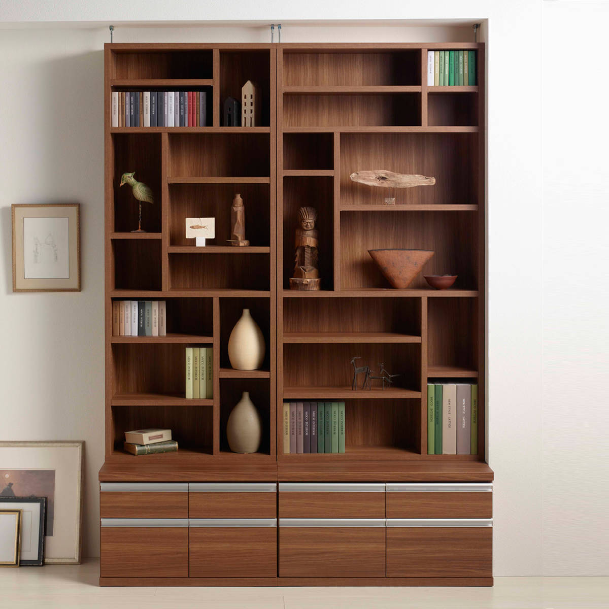 浅型と深型の引出し収納が2杯ずつ設けられています。スライドレール付きなのでスムーズな開閉ができ、雑貨やDVDソフト、衣類などもたっぷりと収納ができます。